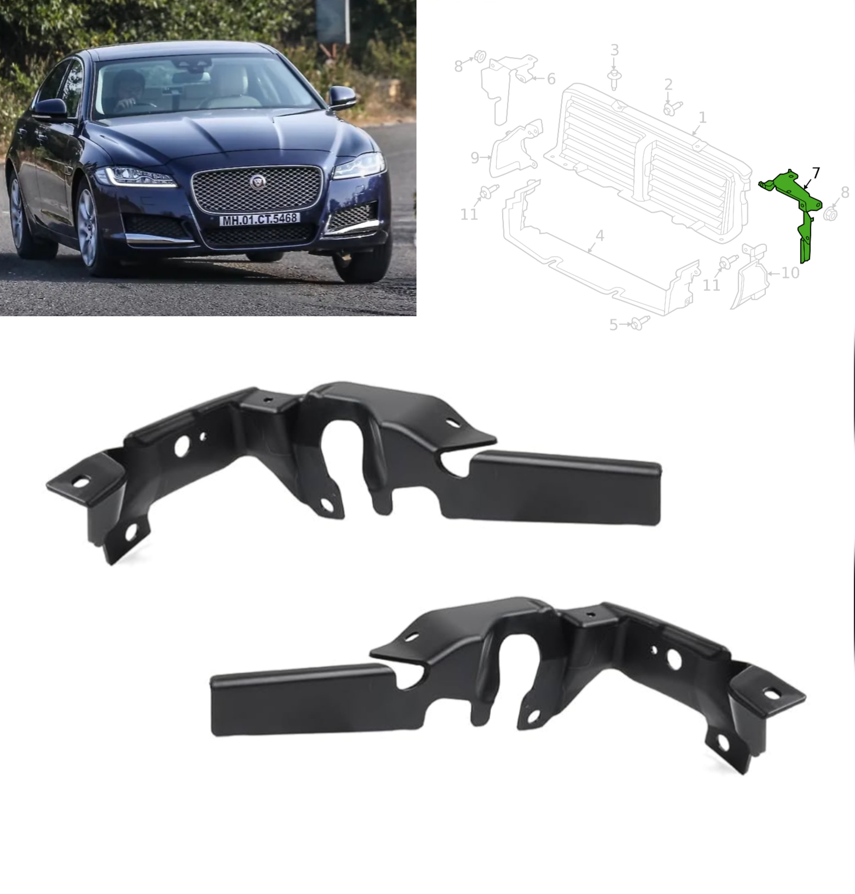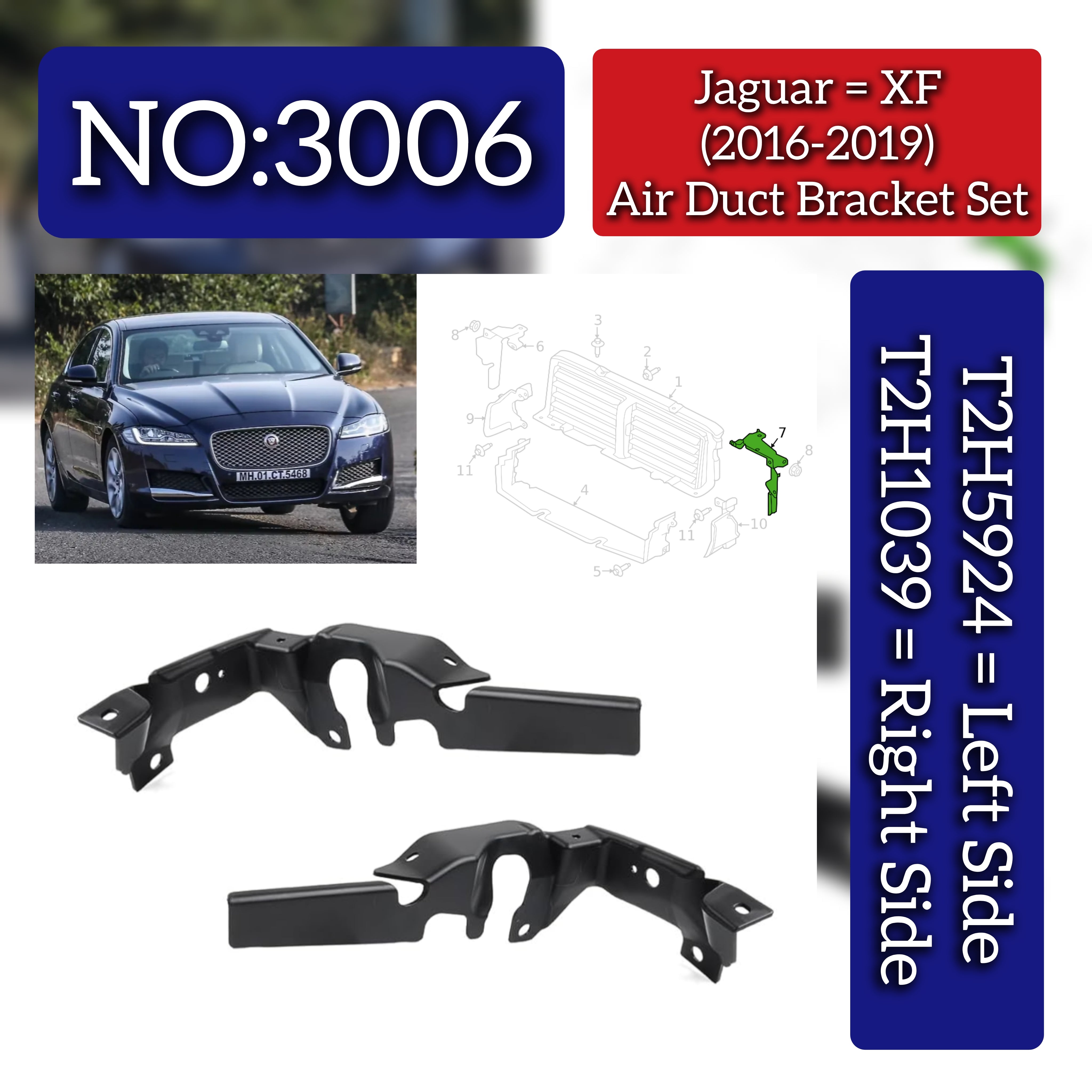 Air Duct Bracket Set designed for Jaguar XF models from 2016 to 2019. This matched pair includes the left bracket (T2H5924) and right bracket (T2H1039), engineered to direct airflow efficiently through your vehicle's climate control system. OEM-quality construction ensures precise fitment and reliable performance. Direct replacement for factory components, restoring proper ventilation distribution. Essential for maintaining optimal cabin comfort and HVAC system functionality. Tag No.3006 for accurate identification and ordering.