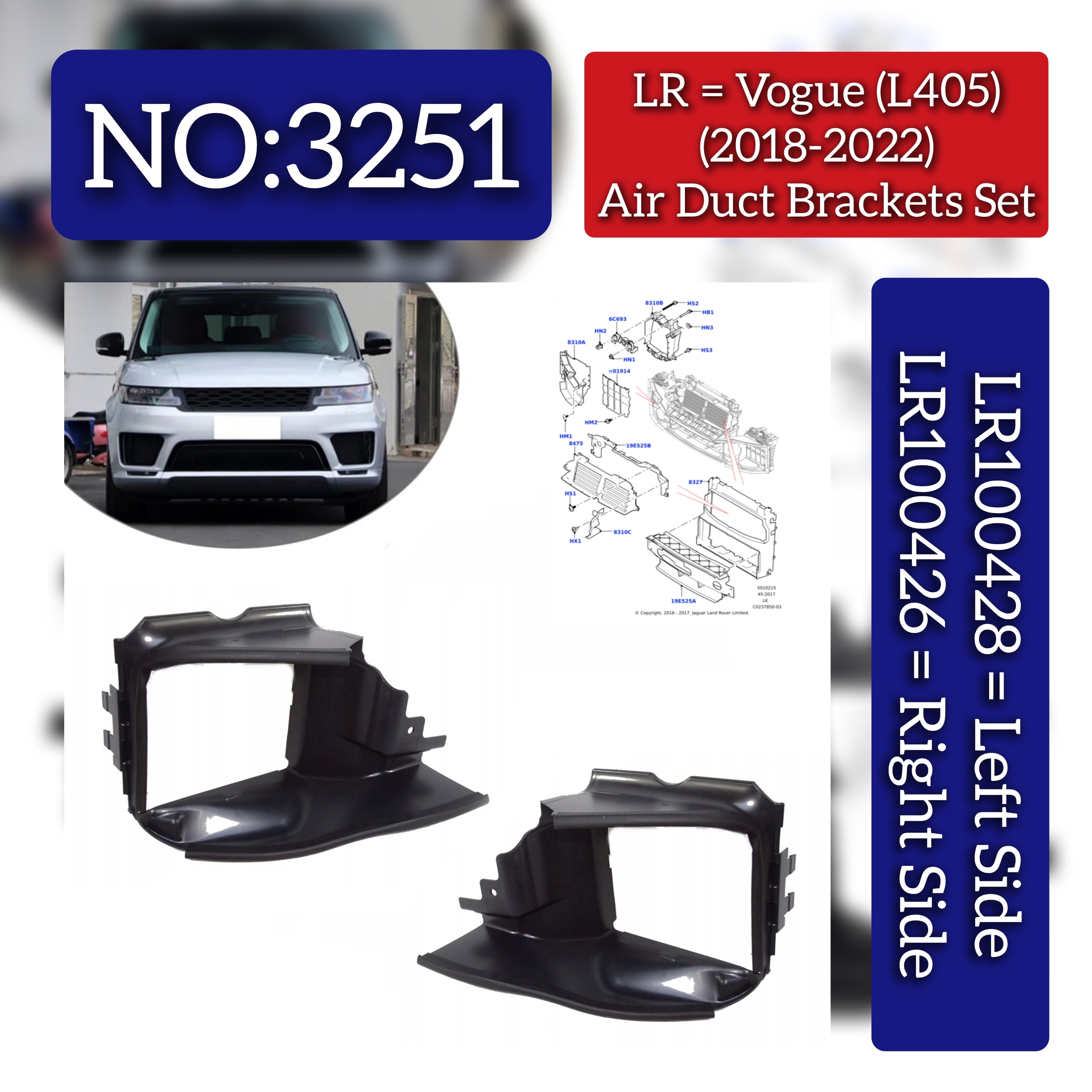 This Air Duct Brackets Set, comprising the right bracket LR100426 and left bracket LR100428, is designed for Land Rover Range Rover Vogue L405 models from 2018 to 2022. These brackets ensure precise and secure mounting of air ducts, maintaining proper airflow and cooling efficiency. Manufactured to OEM standards, they provide a reliable fit, supporting optimal vehicle performance and longevity of the ventilation system.