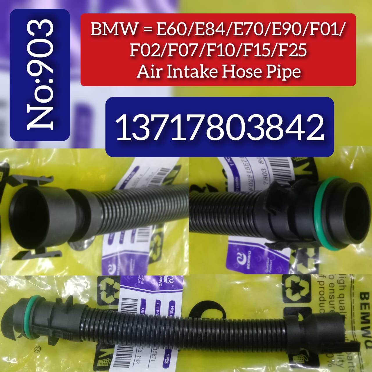 The Air Intake Hose Pipe 13717803842 is precision-engineered for compatibility with BMW models including E60, E84, E70, E90, F01, F02, F07, F10, F15, and F25. It ensures efficient airflow to the engine, which optimizes combustion and enhances engine performance. Built to OEM standards, this hose offers durability and a secure fit, minimizing air leaks and protecting engine components. Suitable for professional maintenance and replacement, it supports sustained vehicle reliability and smooth operation. Tag No. 903 confirms part authenticity and fitment.