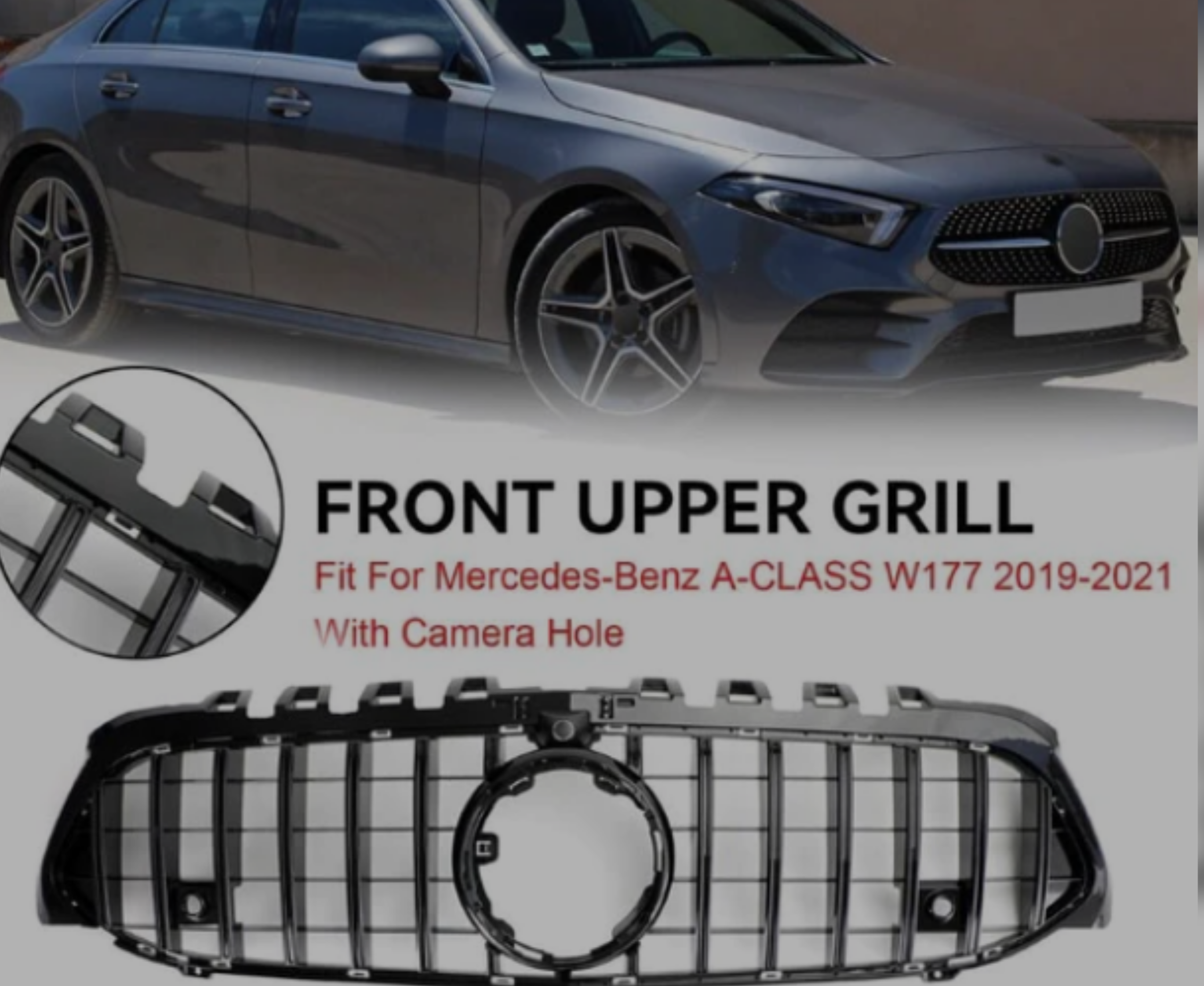 The Benz 177 GTR Silver Chrome Show Grill (2019-2023) offers a dynamic and stylish enhancement for compatible Mercedes-Benz A-Class models:
