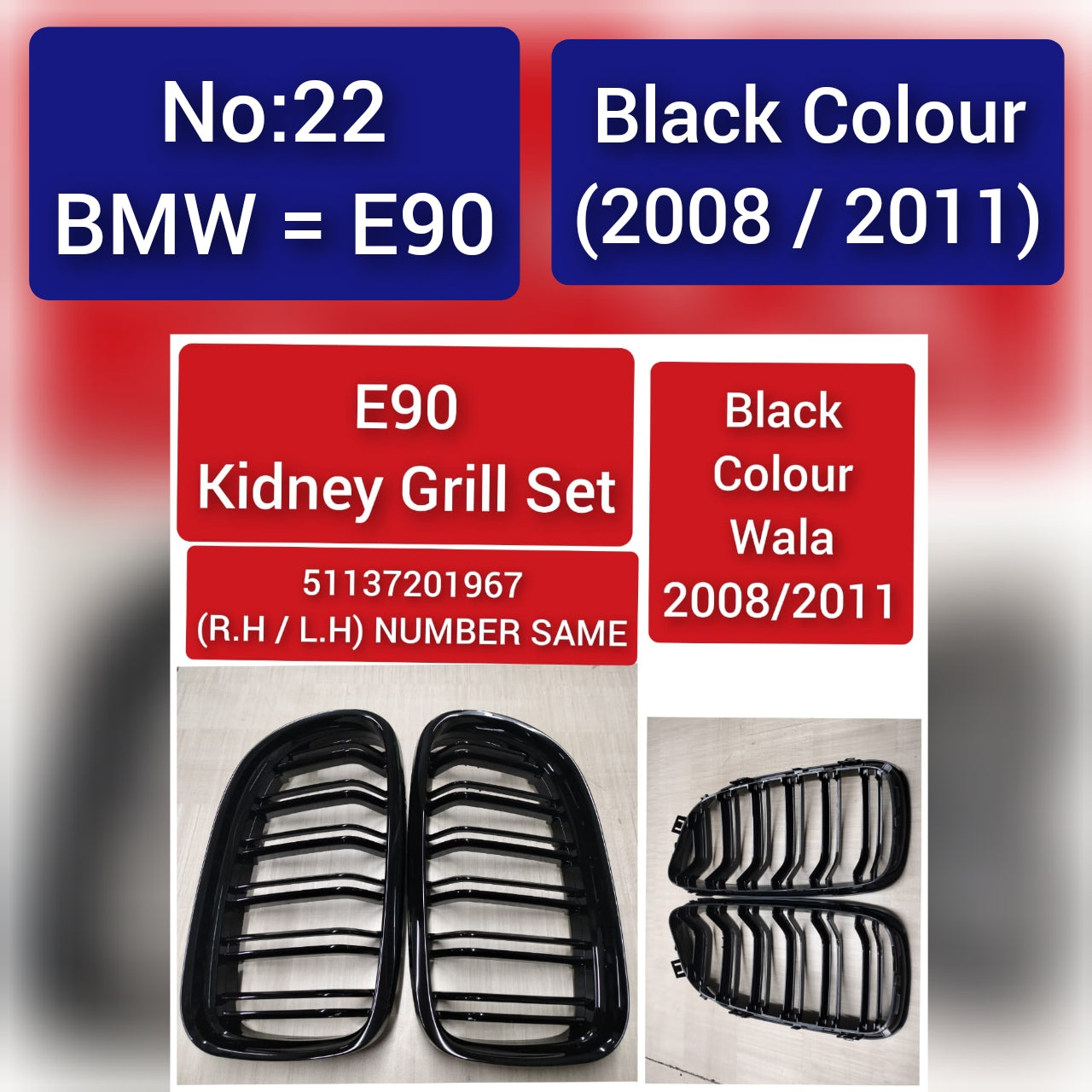 "Upgrade your BMW E9 with this sleek black color E90 Kidney Grill Set from 2008 to 2011."