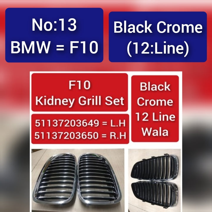 The BMW F10 Black Chrome 12-Line Kidney Grill Set (part number 51137203649 for the left side and 51137203650 for the right side) offers a bold and luxurious upgrade for compatible BMW 5 Series (F10) models: