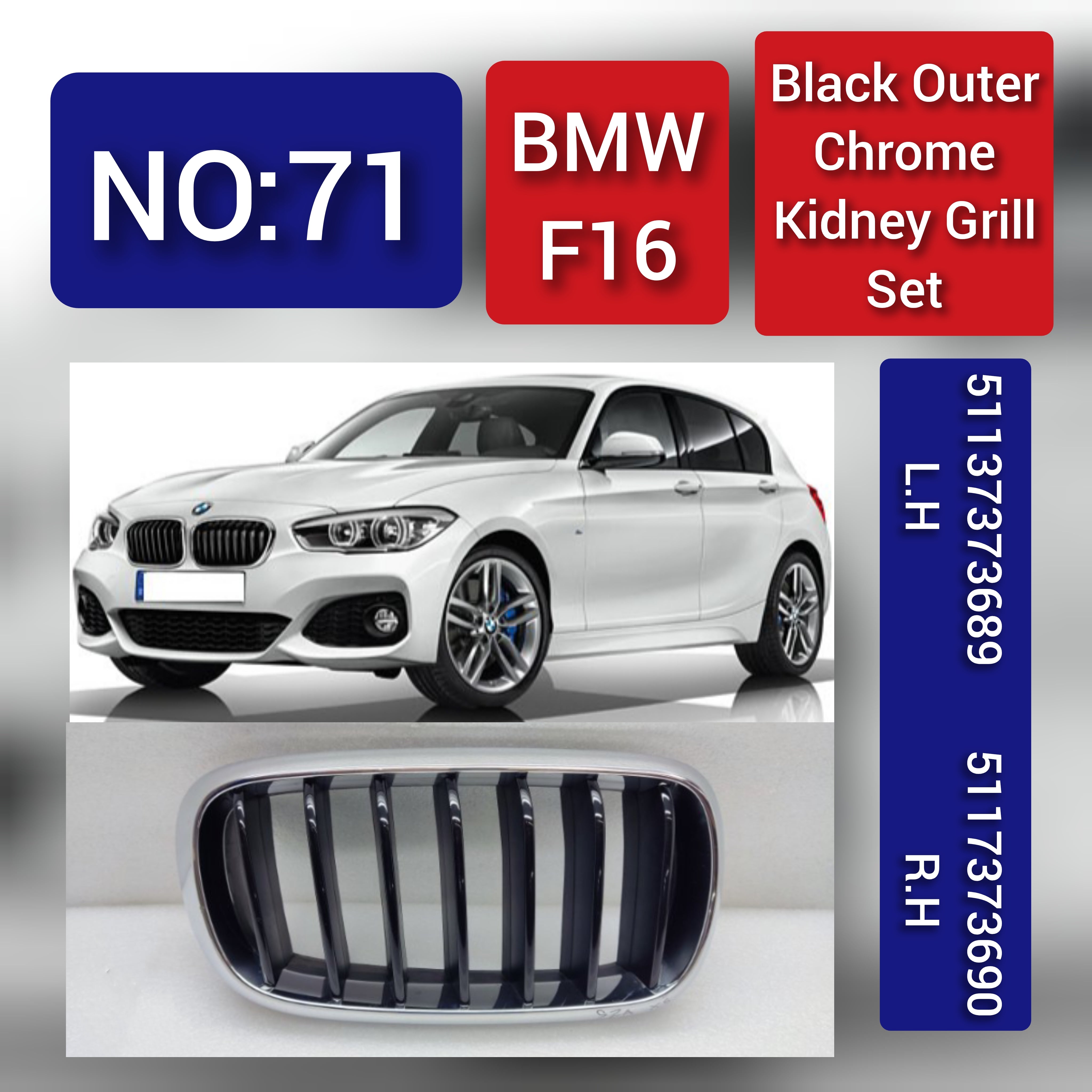Enhance the boldness of your BMW F16 with the sleek Black Outer Chrome Kidney Grill Set, meticulously designed to elevate your vehicle's front-end aesthetics."