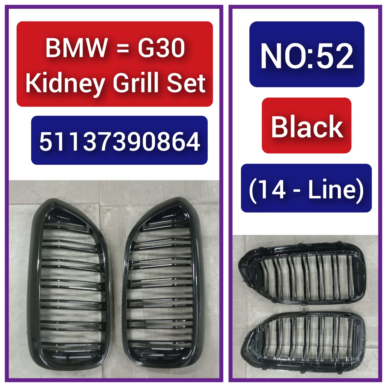 Enhance the sleekness of your BMW G30 with the Black 14-Line Kidney Grill Set, meticulously designed to elevate your vehicle's front-end aesthetics."