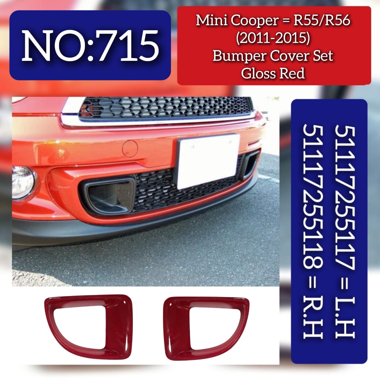 Elevate your MINI Cooper's front-end aesthetics with these premium gloss red bumper covers, engineered for R55/R56 models (2011-2015). This matched pair features OEM part numbers 51117255117 (left) and 51117255118 (right), ensuring perfect fitment and alignment. The vibrant gloss red finish delivers a factory-fresh appearance while protecting underlying components from minor impacts and road debris. Direct bolt-on installation requires no modifications. Ideal for restoring worn covers or upgrading to a bolder look. Tag No.715 for easy identification and ordering.