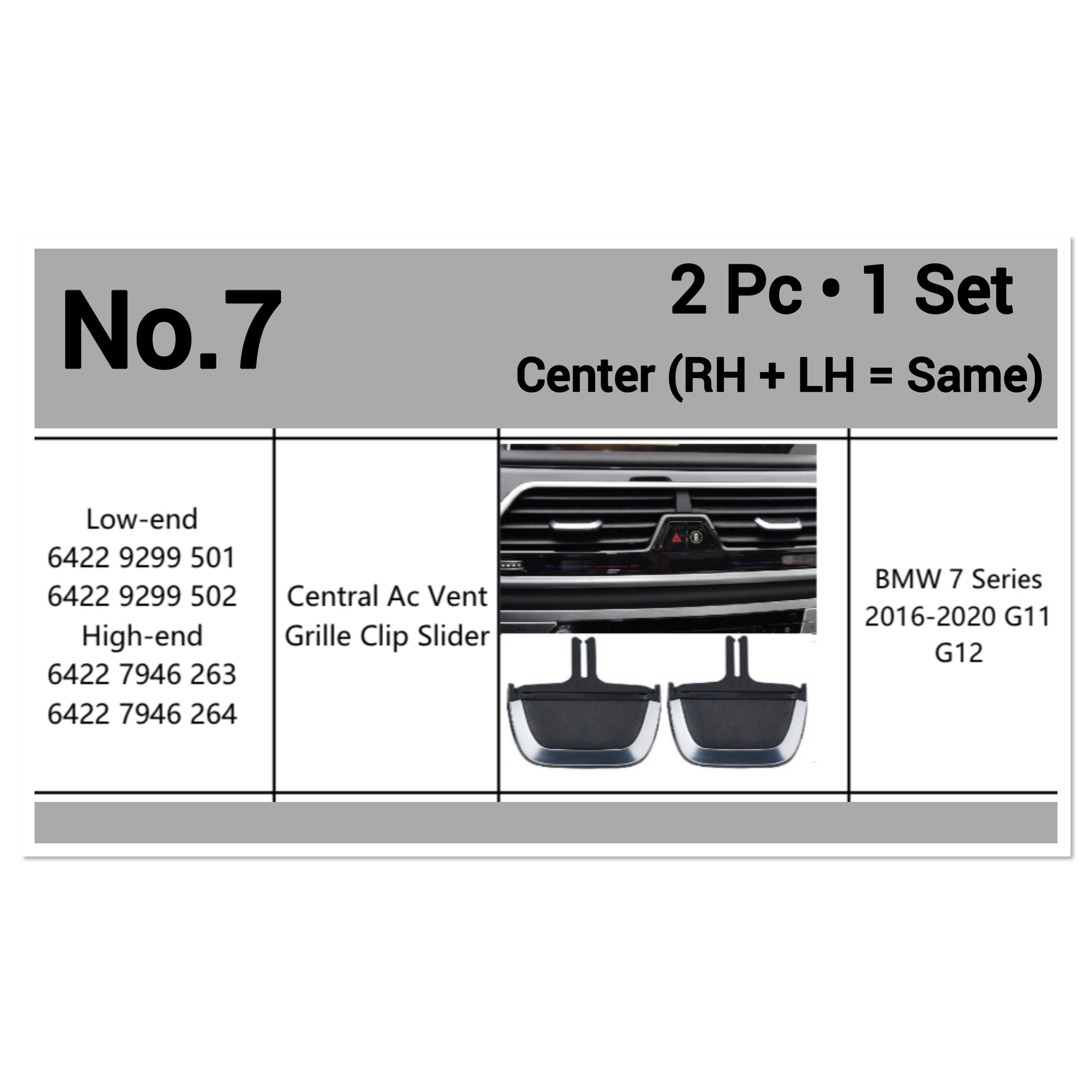 This repair kit is compatible with the BMW 7 Series G11 G12 and includes 2 center air conditioner back AC vent grille outlet tab clip sliders. Keep your air conditioning system functioning properly and maintain optimal air flow with this high-quality repair kit. A must-have for any BMW 7 Series owner.