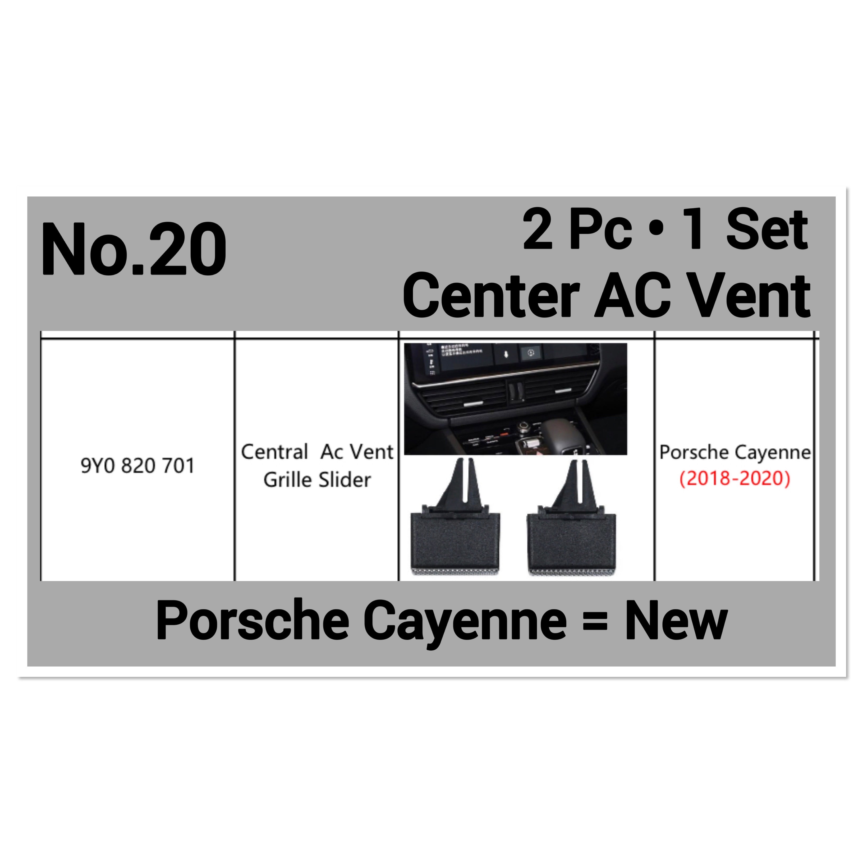 This repair kit is compatible with PORSCHE CAYENNE 2018-2020 and comes in a set of 2. Made for the Center Air Conditioner Back Ac Vent Grille Outlet, it includes a tab clip and slider to ensure a secure and functional fit. Keep your air conditioning unit running smoothly with this easy-to-use repair kit.