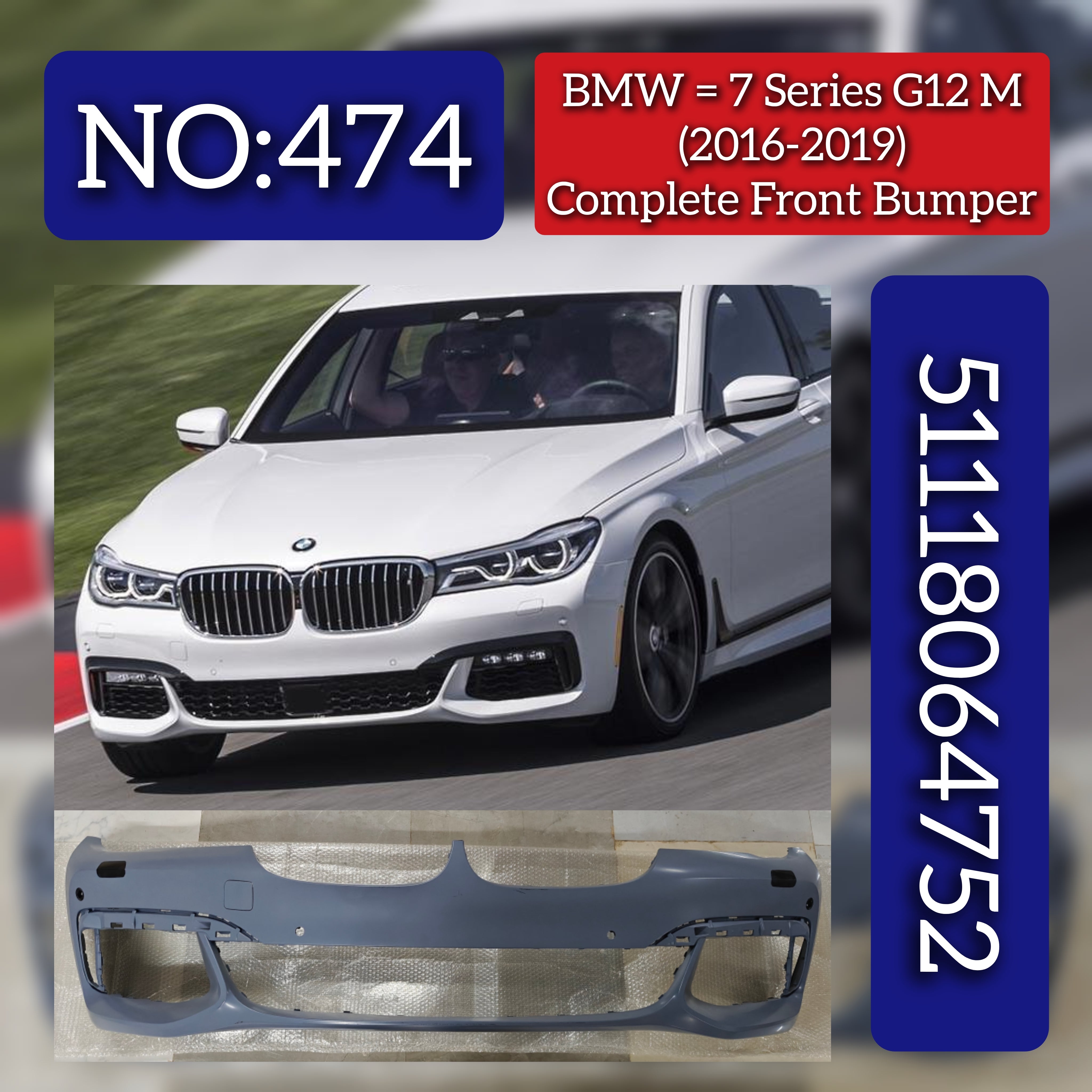 This Complete Front Bumper (part number 51118064752) is tailored for BMW 7 Series (G12) models from 2016 to 2019. Designed to OEM standards, it offers precise fitment and contributes to the vehicle’s structural integrity. The bumper’s robust construction provides effective impact absorption, enhancing occupant safety while preserving the vehicle’s sleek appearance. Tag No.474 verifies its compatibility and quality, ensuring a seamless replacement that maintains the original performance and design of your BMW.