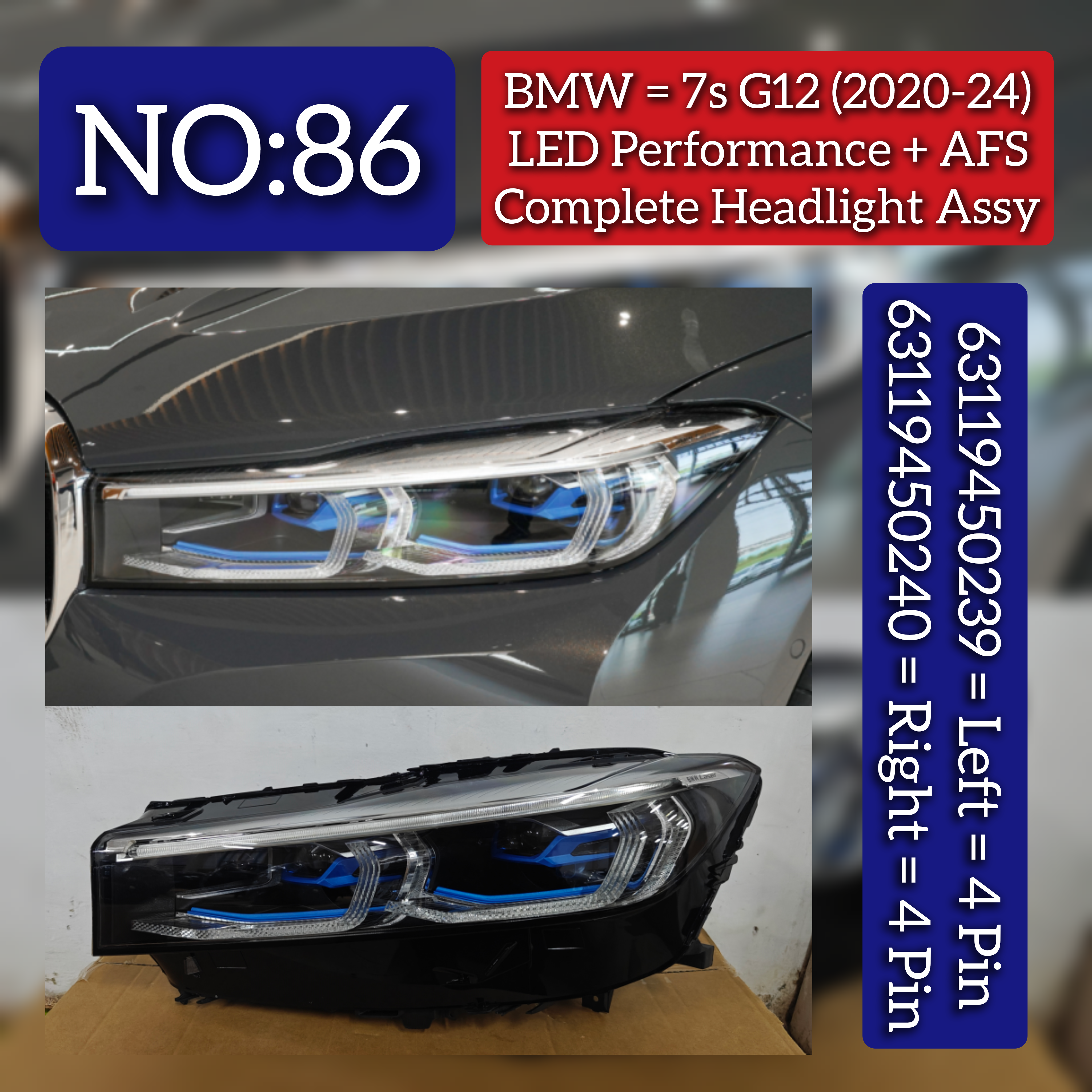 This complete headlight assembly is designed for BMW 7 Series (G12) models from 2020 to 2024, featuring advanced LED Performance combined with Adaptive Front-lighting System (AFS). It includes both left (63119450239) and right (63119450240) units with 4-pin connectors for seamless integration. Engineered to deliver superior illumination and enhanced safety, this assembly ensures precise beam control and improved visibility in various driving conditions. Elevate your vehicle’s lighting performance with this high-quality, factory-compatible upgrade.