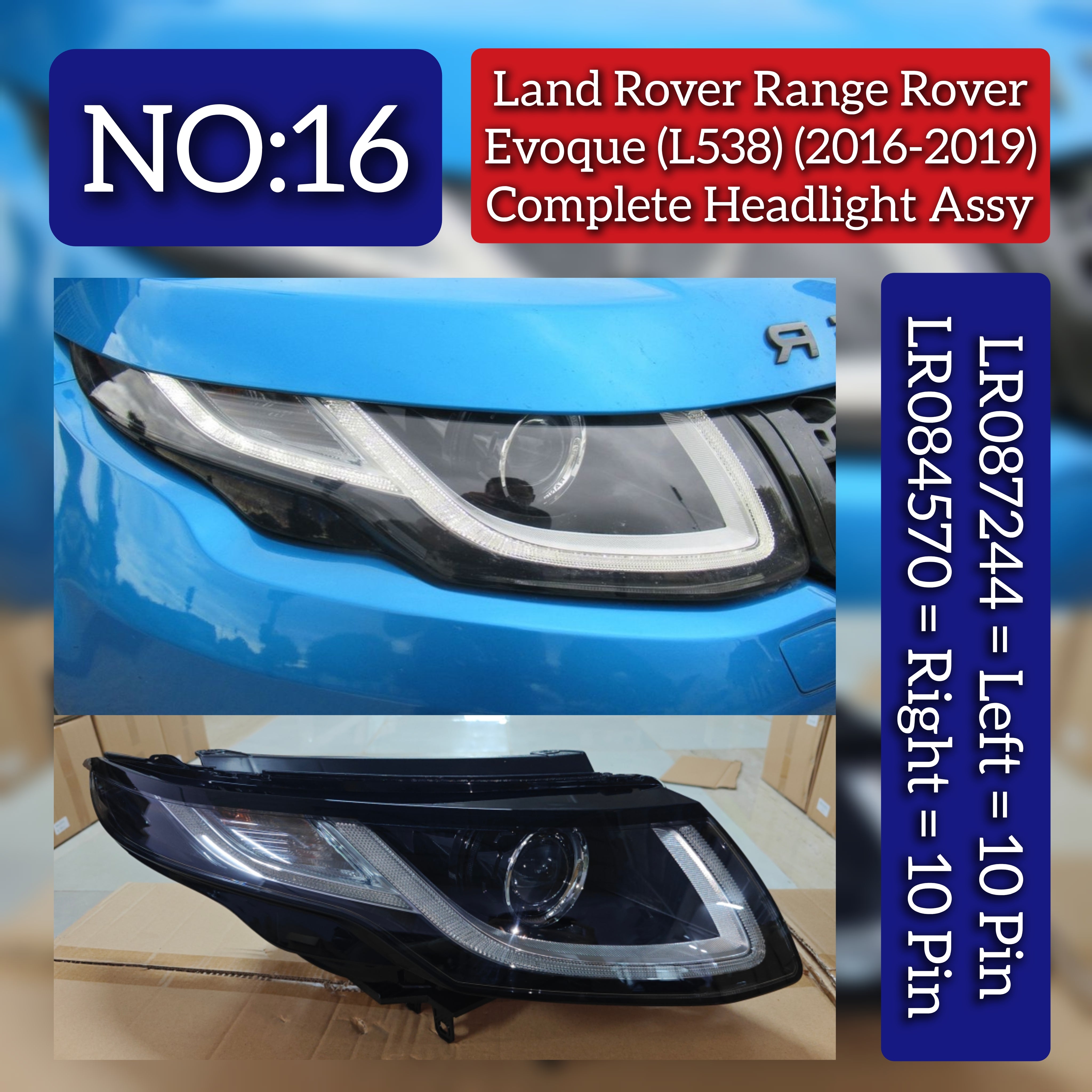 This Complete Headlight Assembly Set includes left (LR087244) and right (LR084570) units with 10-pin connectors, designed for Land Rover Range Rover Evoque L538 models (2016-2019). Engineered for exact fit and optimal functionality, these headlights restore your vehicle’s original lighting efficiency, improving visibility and safety. Manufactured to meet stringent quality standards, this set is ideal for precise replacements or professional upgrades.