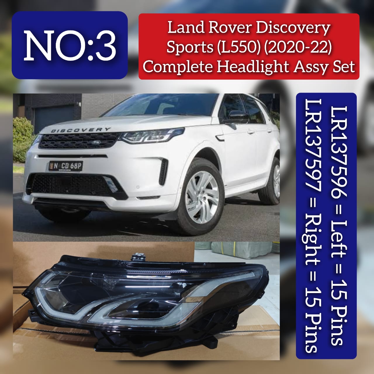 Upgrade your Land Rover Discovery Sport (L550) with this high-quality set of a complete headlight assembly for both right and left sides (Tag No.03). Directly compatible with LR137597 and LR137596, this set ensures perfect fit and function for improved visibility and safety on the road.