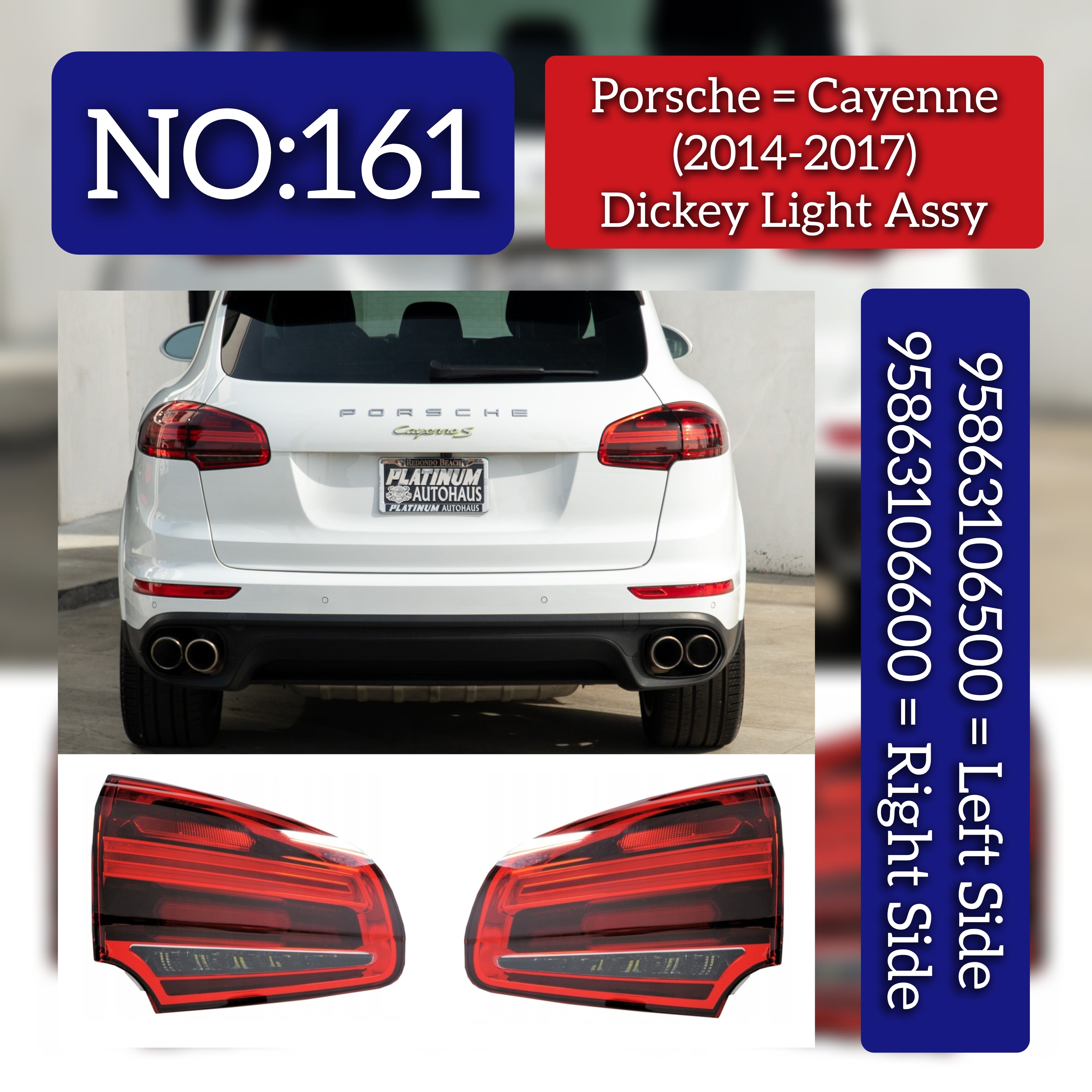 This Dickey Light Assembly Set, comprising Left (95863106500) and Right (95863106600) units, is designed specifically for Porsche Cayenne models from 2014 to 2017. Engineered to meet OEM standards, these assemblies ensure optimal rear lighting performance and durability. Easy to install, they provide reliable illumination critical for vehicle safety and visibility, maintaining authenticity and function for your Porsche Cayenne.
