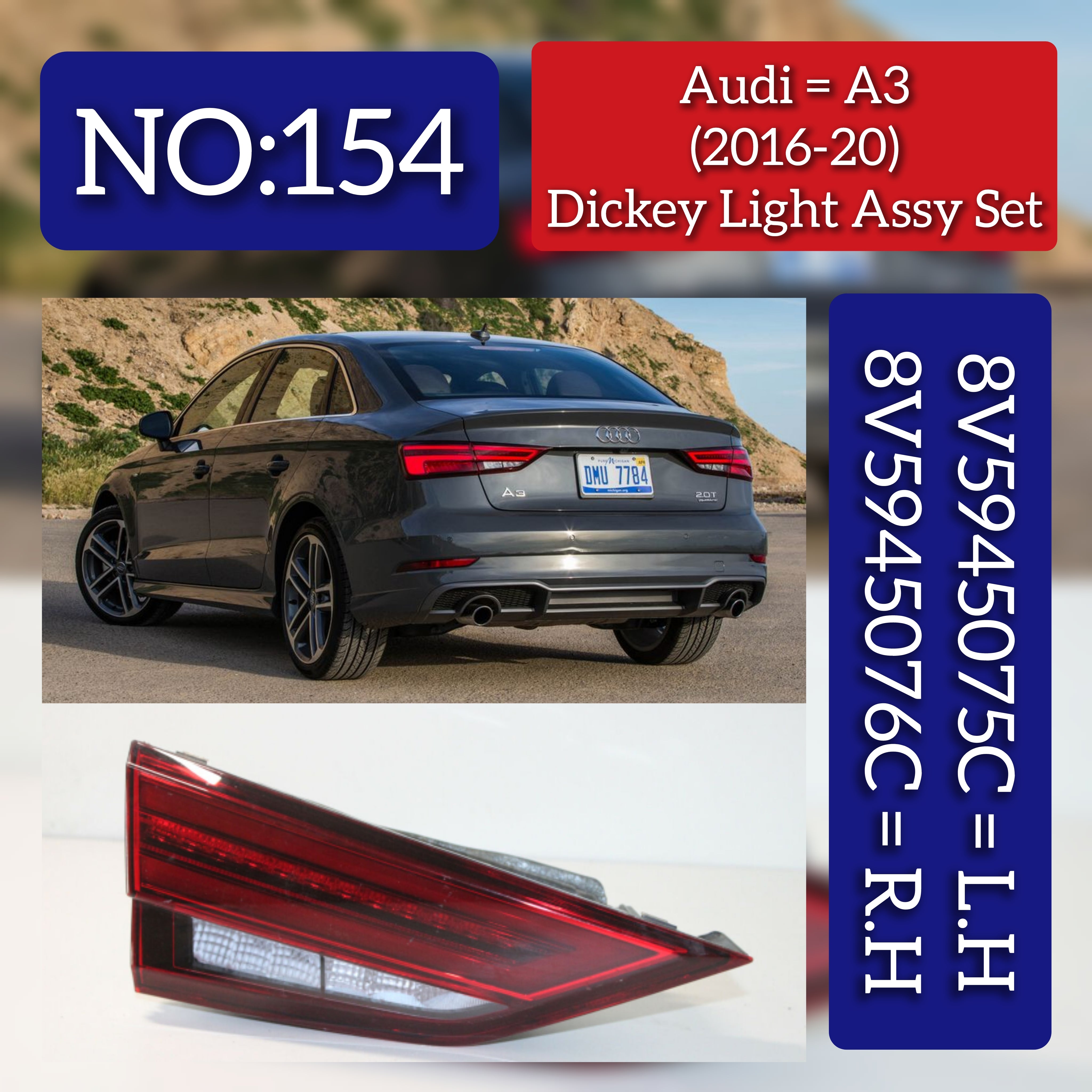 This Dicky Light is specifically designed for the AUDI A3 Convertible (8V7, 8VE) and A3/S3 (2016-2020) models. It includes both the Left (8V5945075C) and Right (8V5945076C) lights for a complete and compatible fit. Upgrade your car's lighting system and enhance visibility on the road with these top-quality Dicky Lights.