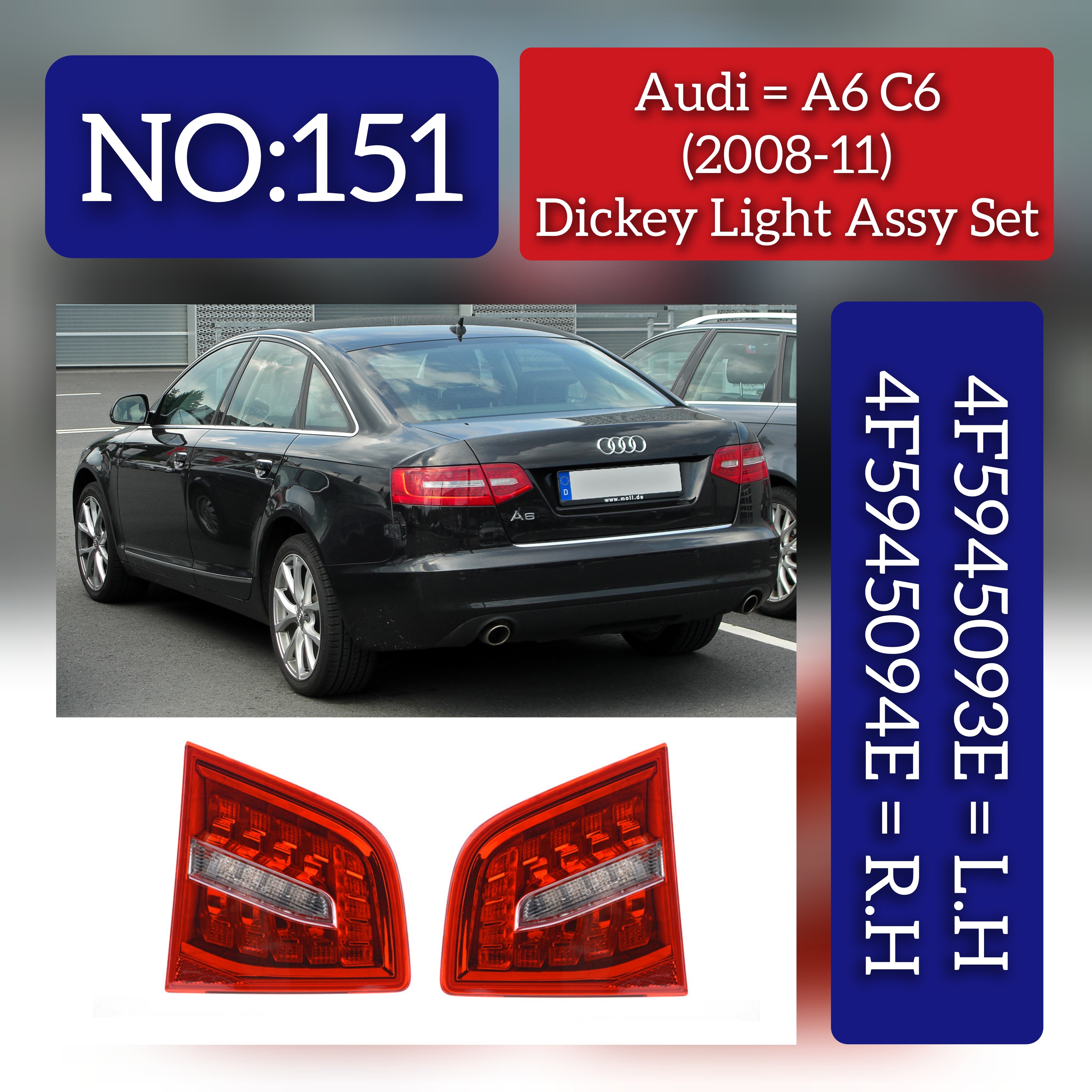 Enhance your driving experience with the Dicky Light compatible with AUDI A6 C6 (4F2) and A6/S6 models. This set includes both Left and Right 4F5945093E and 4F5945094E lights, providing increased visibility and safety on the road. Upgrade your car with this expertly designed and compatible Dicky Light.