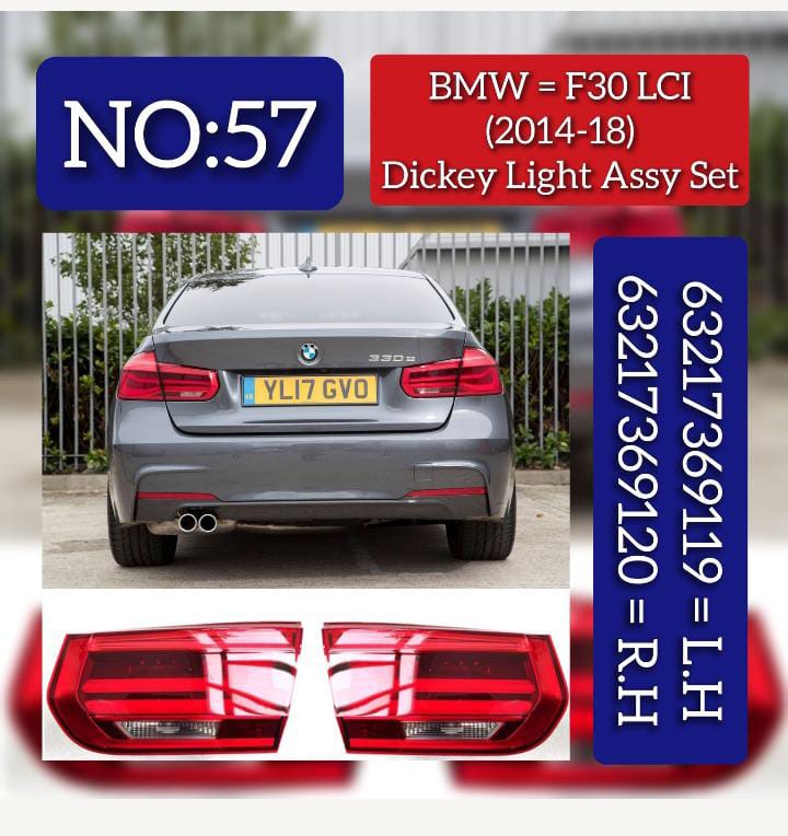 Upgrade your BMW 3 Series F30 LCI with the Dicky Light Left 63217369119 & Right 63217369120 Tag-DLB-57. Designed specifically for this model, these lights provide increased visibility and safety while driving. Expertly crafted with precision, these lights are a must-have addition for any BMW enthusiast.