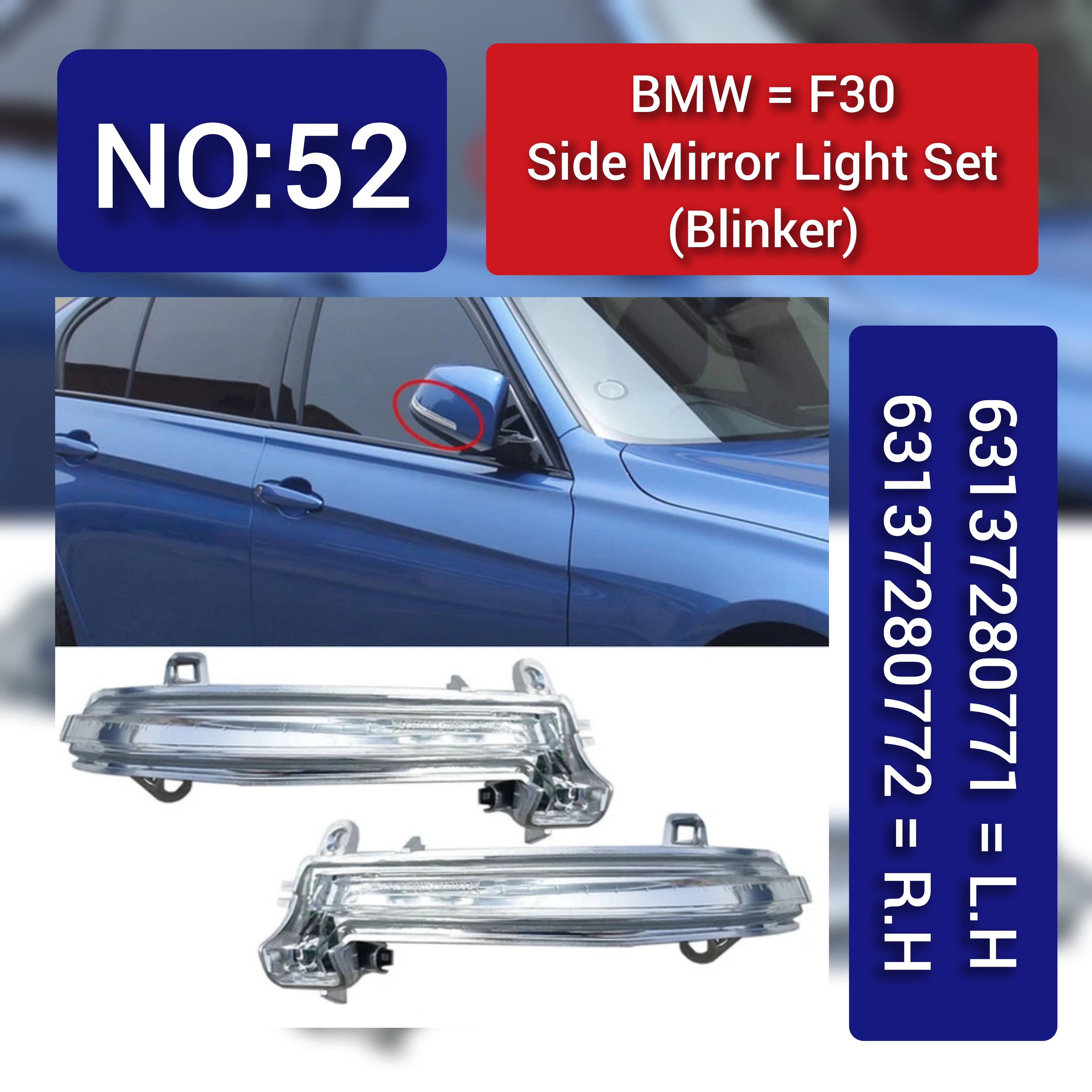 Upgrade your BMW's safety and style with Dynamic Turn Signal LED Mirror Lights. With Left 63137280771 & Right 63137280772 compatibility, these lights are designed for BMW 1 Series (F20), 3 Series F30 F34, and X1 (E84). Enjoy improved visibility and a modern look.