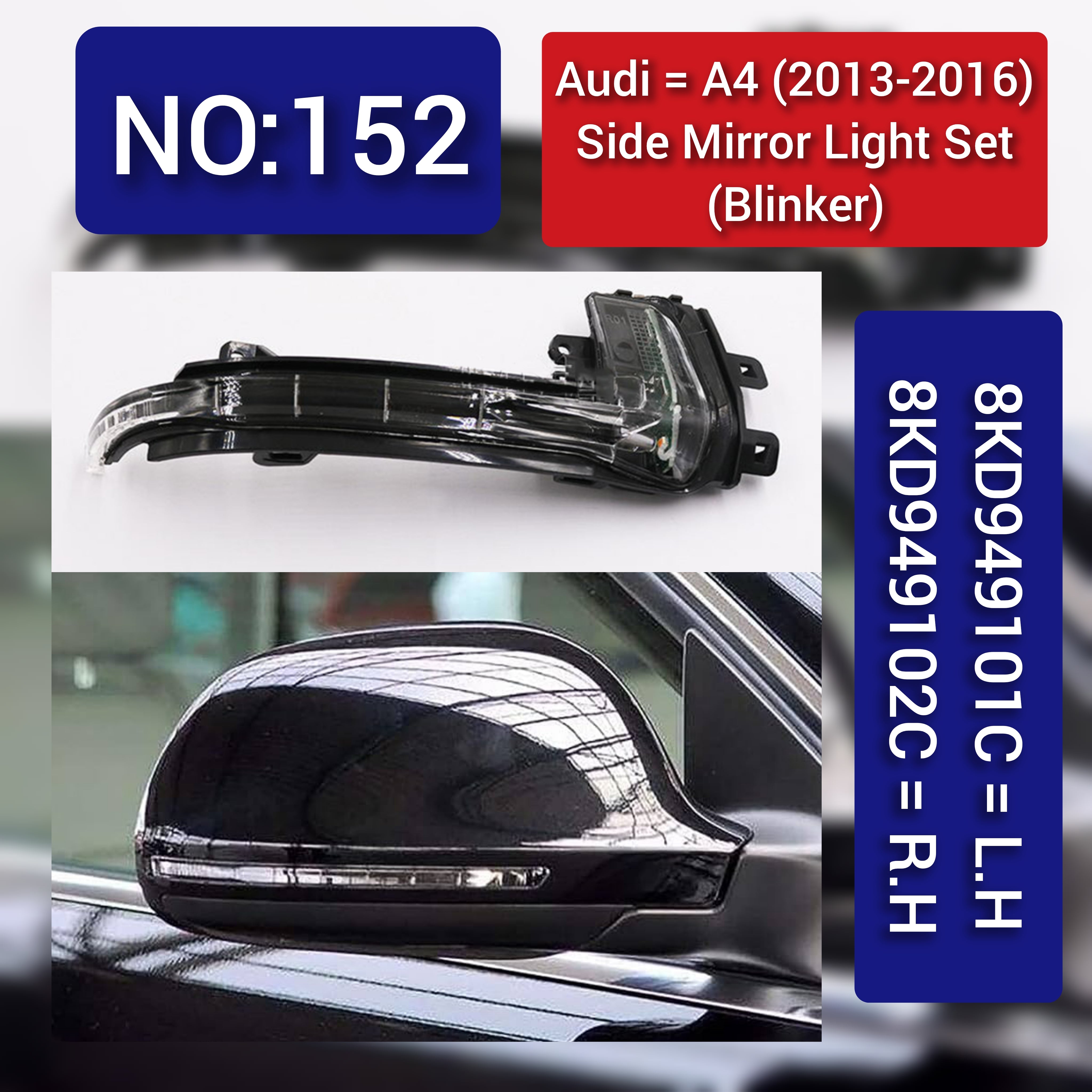 Upgrade your AUDI A4 (2013-2016) with these Dynamic Turn Signal LED Mirror Lights, including left (8KD949101C) and right (8KD949102C) units. Engineered for seamless integration, they provide enhanced signaling visibility through dynamic LED illumination, improving safety during lane changes and turns. These mirror lights combine modern design with OEM compatibility, ensuring reliable performance and a precise fit for your vehicle.