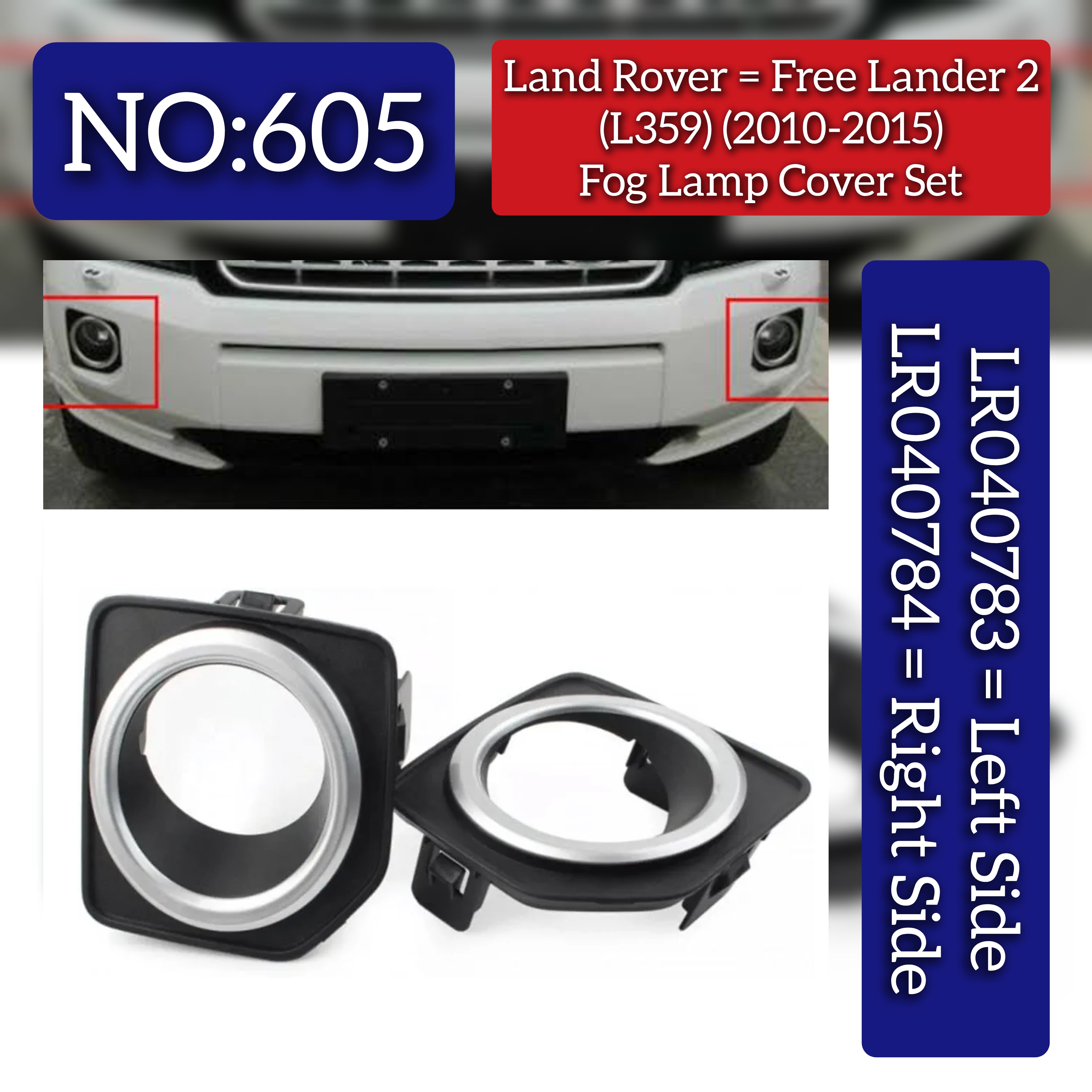 Precision-engineered fog lamp bezel set for LANDROVER FREELANDER 2 (L359) and LR2 models. Features OEM-compatible part numbers LR040783 (left) and LR040784 (right) for perfect fitment. Constructed from durable materials to withstand harsh weather conditions while maintaining the vehicle's aesthetic integrity. Essential for proper fog lamp functionality and front-end appearance restoration.