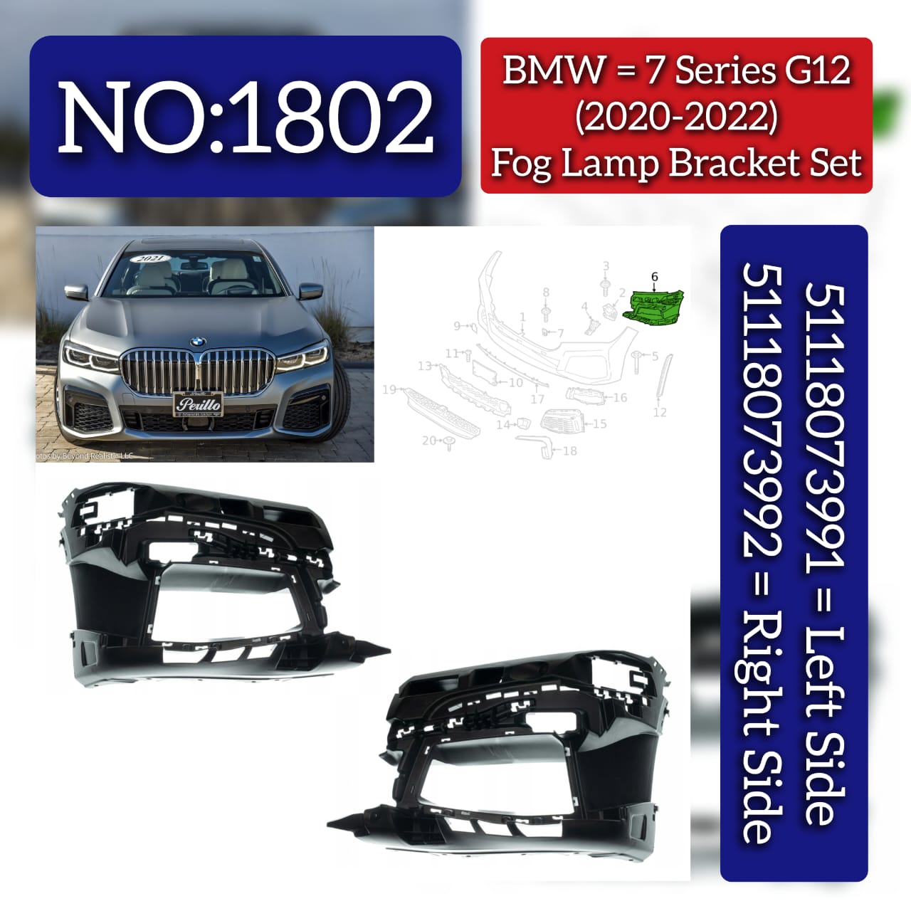 Precision-engineered fog lamp brackets tailored for BMW 7 Series G12 (2020-2022). This dual-bracket assembly includes left unit 51118073991 and right unit 51118073992, engineered to OEM specifications for seamless integration. These brackets provide robust support and precise positioning for your fog lighting system, ensuring optimal beam alignment and structural integrity. Built with premium materials to withstand demanding automotive conditions. Perfect for restoring factory-original fog lamp installation or upgrading your vehicle's lighting setup with guaranteed compatibility.