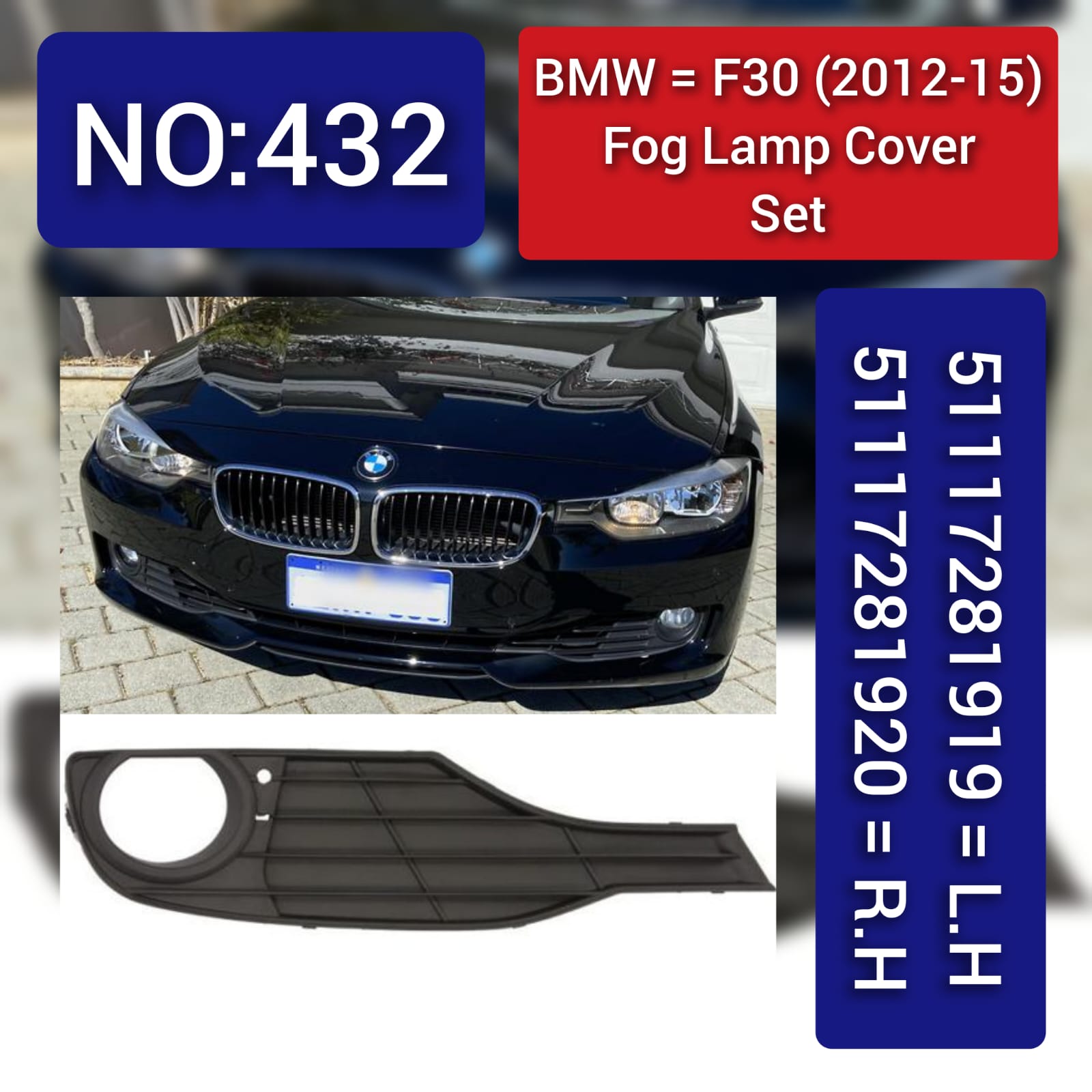 Genuine OEM fog lamp covers designed specifically for BMW F30 models (2012-2015). This set includes both left (51117281919) and right (51117281920) covers, ensuring complete front-end protection and aesthetic appeal. Manufactured to exact BMW specifications, these covers safeguard your fog lamps from debris, moisture, and UV damage while maintaining the vehicle's factory appearance. Direct fit installation with no modifications required. Essential replacements for damaged or missing covers. Tag No.432 for easy identification and ordering.