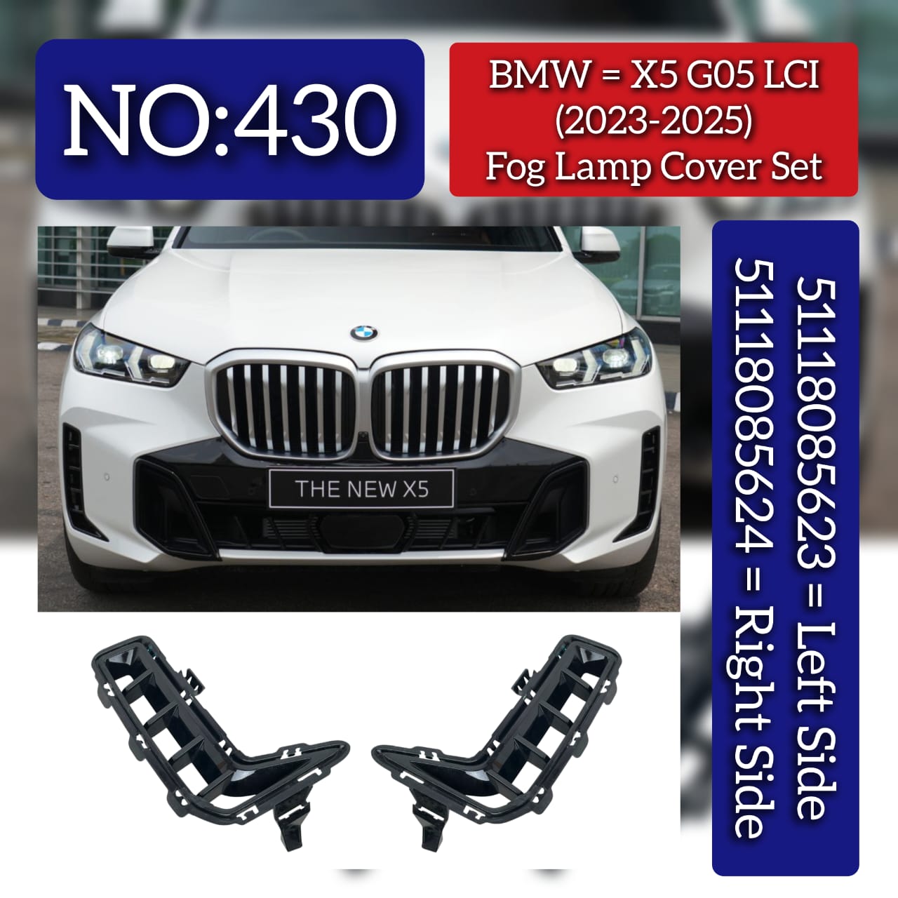 Genuine OEM fog lamp covers designed specifically for BMW X5 G05 LCI models (2023-2025). This matched pair includes both left (51118085623) and right (51118085624) covers, ensuring perfect symmetry and factory-correct fitment. Crafted from premium materials to withstand harsh road conditions while maintaining clarity and aesthetic appeal. Direct replacement for damaged or worn covers restores your vehicle's front-end appearance and protects the fog lamp assembly. Tag No.430 for easy identification and ordering. Engineered to BMW specifications for seamless integration with your X5's design language.