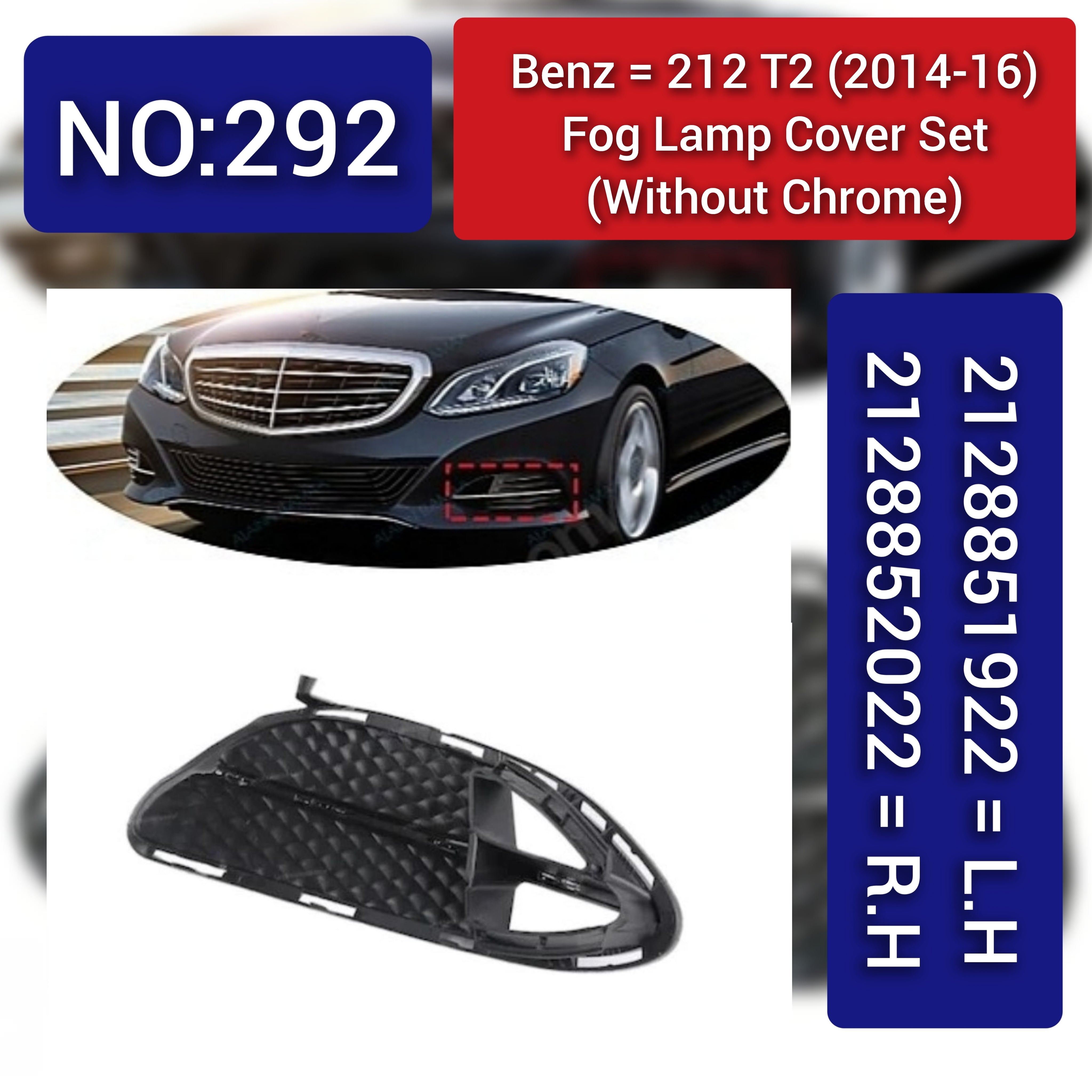 Designed for the MERCEDES-BENZ E-CLASS (W212), these fog lamp covers without chrome provide a precise fit for the left (2128851922) and right (2128852022) sides. Manufactured to meet OEM quality standards, they protect your fog lamps from damage and environmental factors while preserving the vehicle’s original, understated look. Ideal for maintaining both durability and authentic styling.