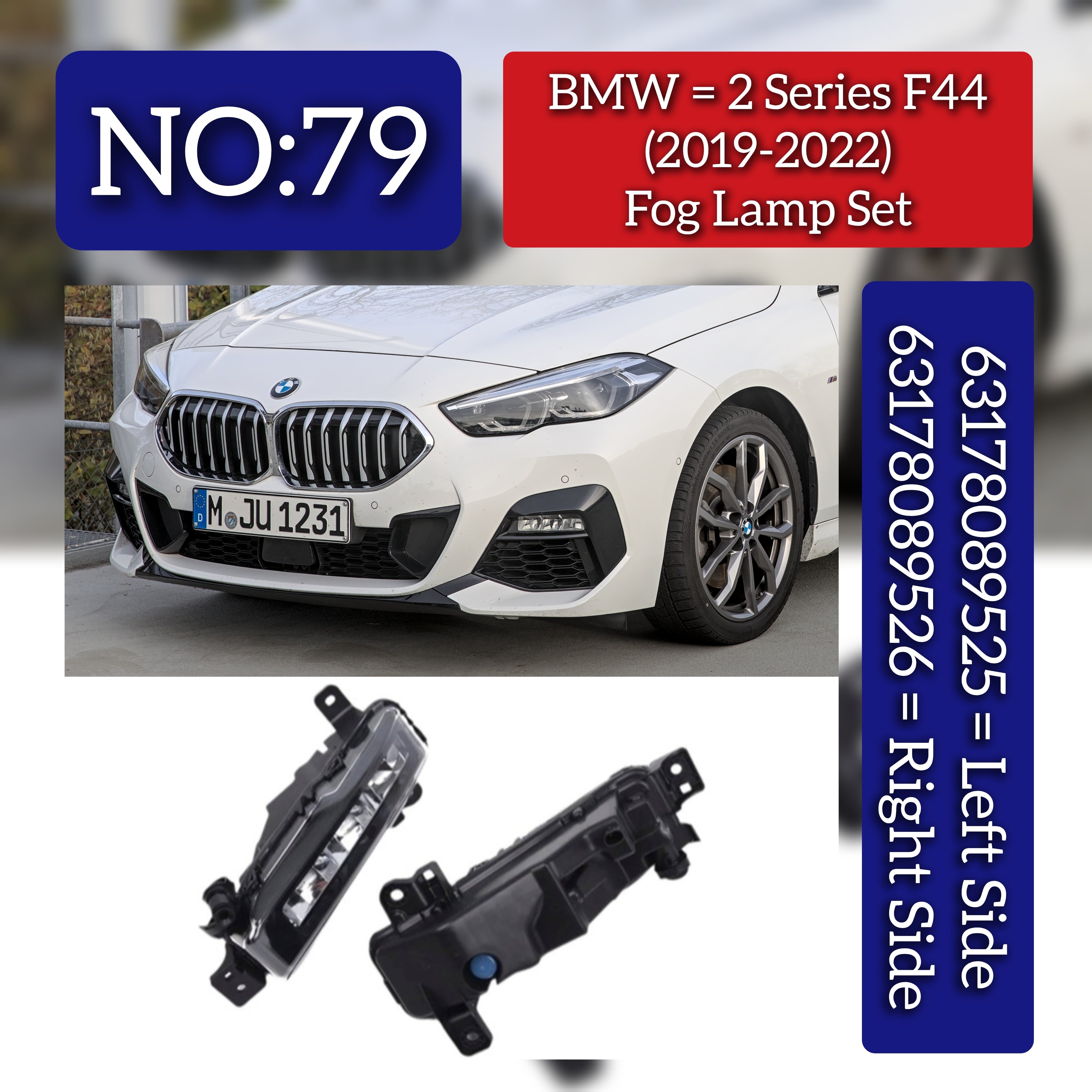 These fog lamps, right (63178089526) and left (63178089525), are precision-engineered for the BMW 2 Series F44 (2019-22), identified with Tag No.79. They deliver improved visibility in adverse weather by illuminating close-range areas while reducing glare, enhancing overall driving safety. Built to OEM specifications, these durable lamps ensure seamless integration and consistent lighting performance, preserving your vehicle’s original equipment standards.