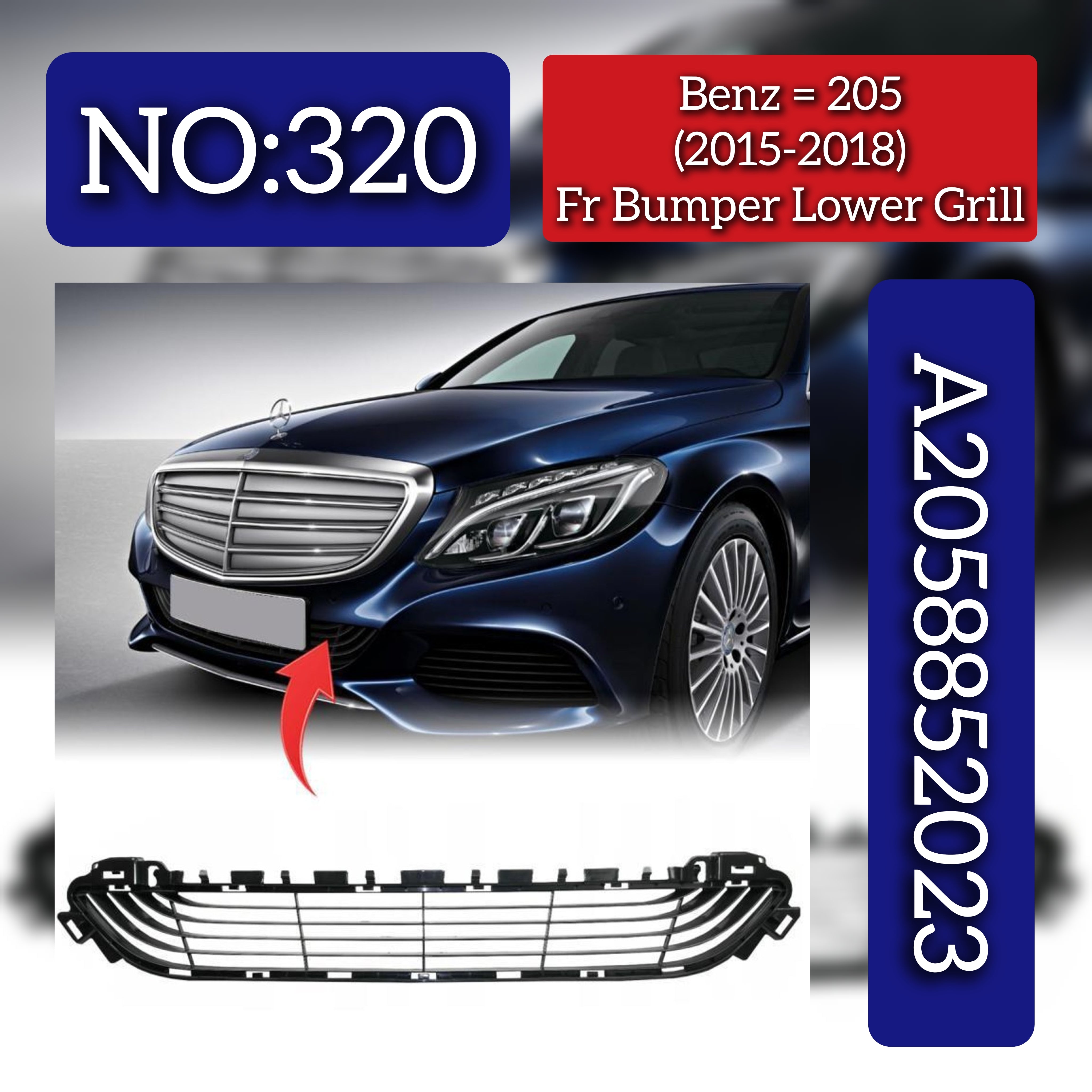 Designed for Mercedes Benz 205 models from 2015 to 2018, this front bumper lower grill (A2058852023) offers a precise OEM fit and reliable durability. It ensures optimal airflow to enhance engine cooling while maintaining the vehicle’s original styling. Ideal for professional replacements, this component is identified by Tag No.320 for straightforward compatibility and installation.