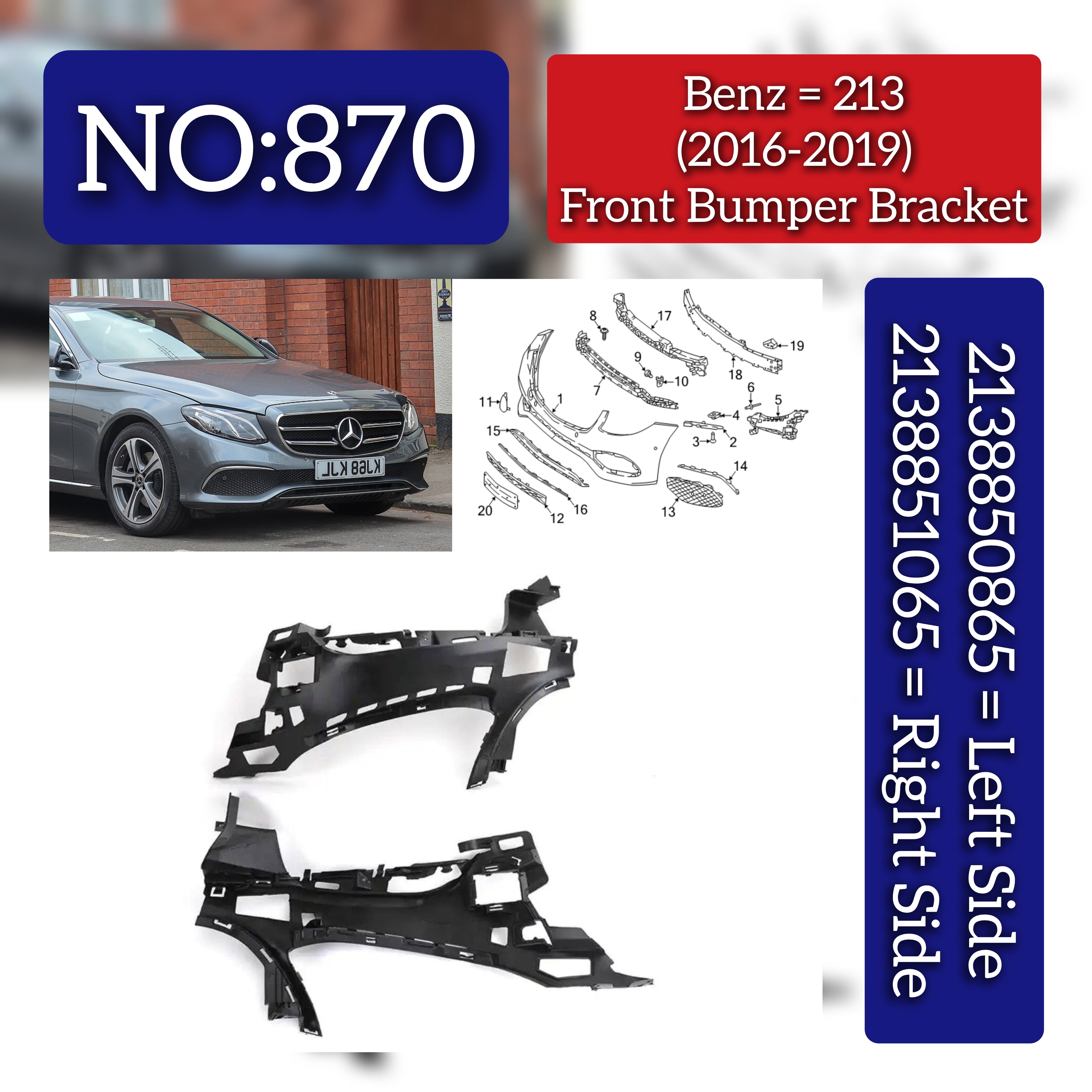 Designed for the Mercedes-Benz E-CLASS W213 (2016-2019), these front bumper brackets—left (2138850865) and right (2138851065)—offer precise fitment and reliable support. Manufactured to OEM specifications, they ensure proper alignment and secure attachment of the front bumper, preserving the vehicle’s structural integrity and safety performance. Ideal for professional repairs or replacements, these brackets maintain the original design standards and durability expected from Mercedes-Benz components.