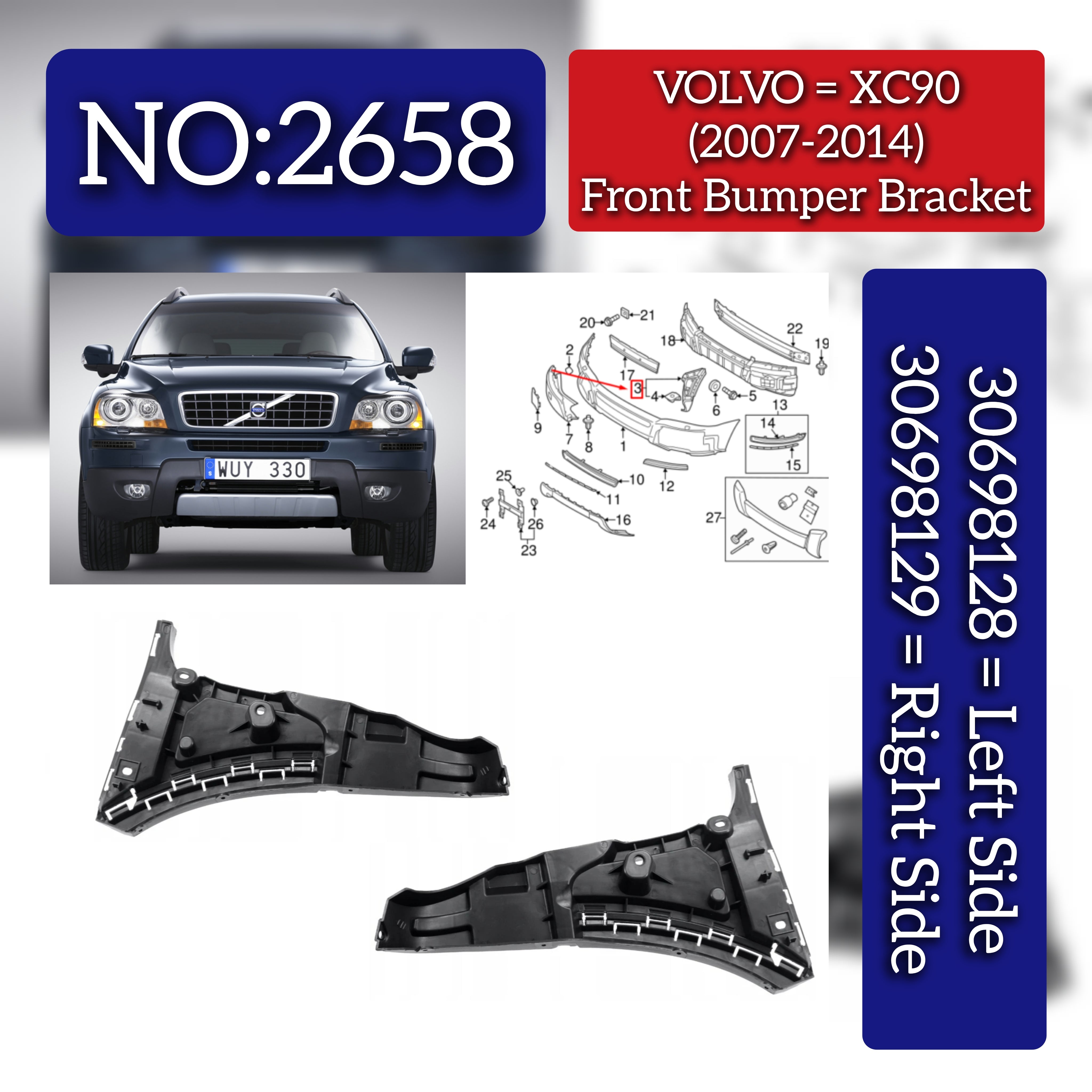 Designed specifically for VOLVO XC90 models from 2007 to 2014, these front bumper brackets (Left: 30698128, Right: 30698129) ensure secure mounting and optimal alignment of your vehicle's front bumper. Manufactured to meet OEM standards, they provide reliable durability and maintain the structural integrity of your vehicle’s front end. Ideal for professional repairs or replacements, these brackets help restore proper fitment and enhance safety by supporting the bumper effectively. Tag No. 2658 confirms precise compatibility and quality assurance.