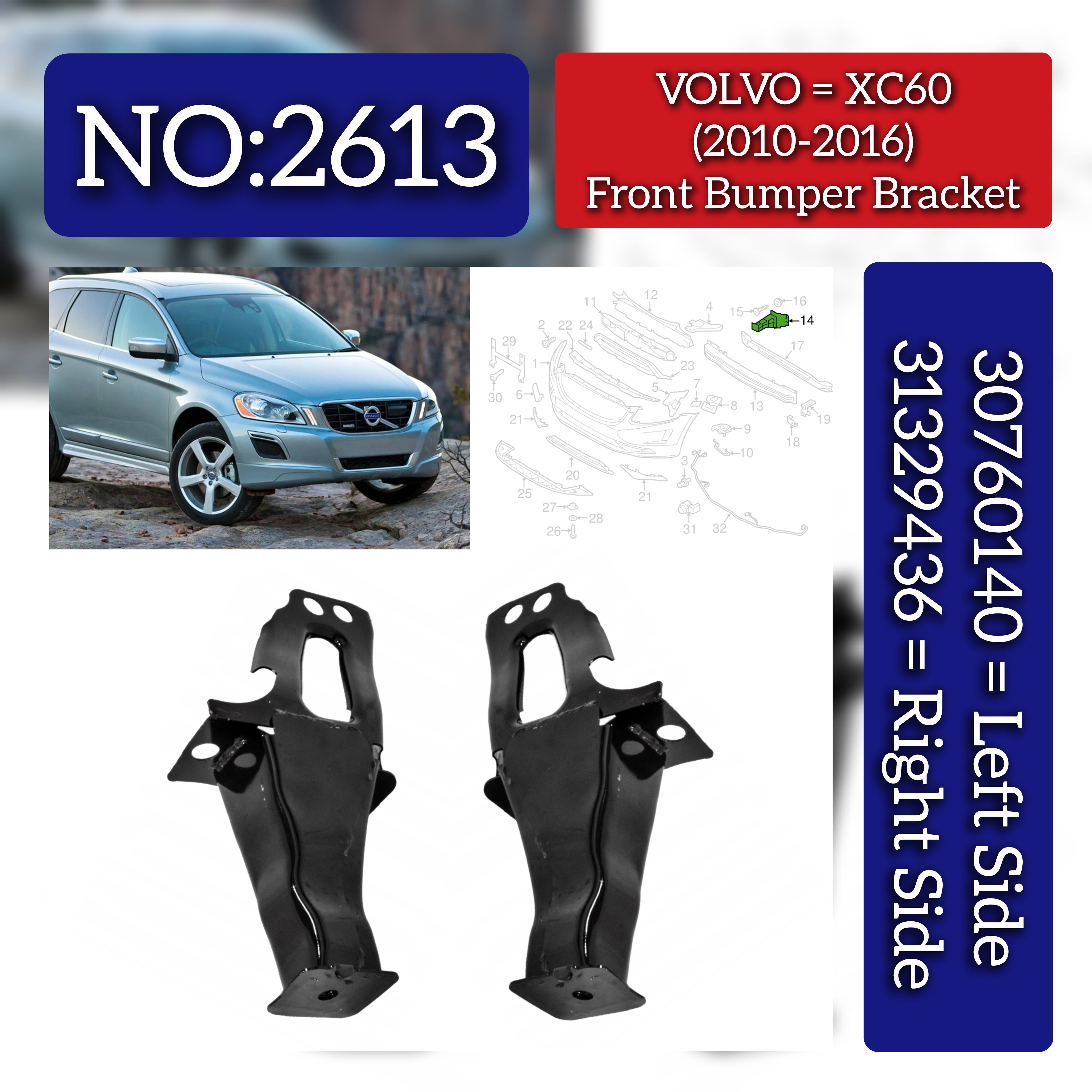This set includes the left front bumper bracket (30760140) and right front bumper bracket (31329436), designed specifically for Volvo XC60 models from 2010 to 2016. Engineered to provide precise fitment and durability, these brackets ensure secure attachment of the front bumper, maintaining the vehicle's structural integrity and appearance after repairs. Ideal for professional replacement, they help restore factory-level safety and alignment. Tag No.2613.