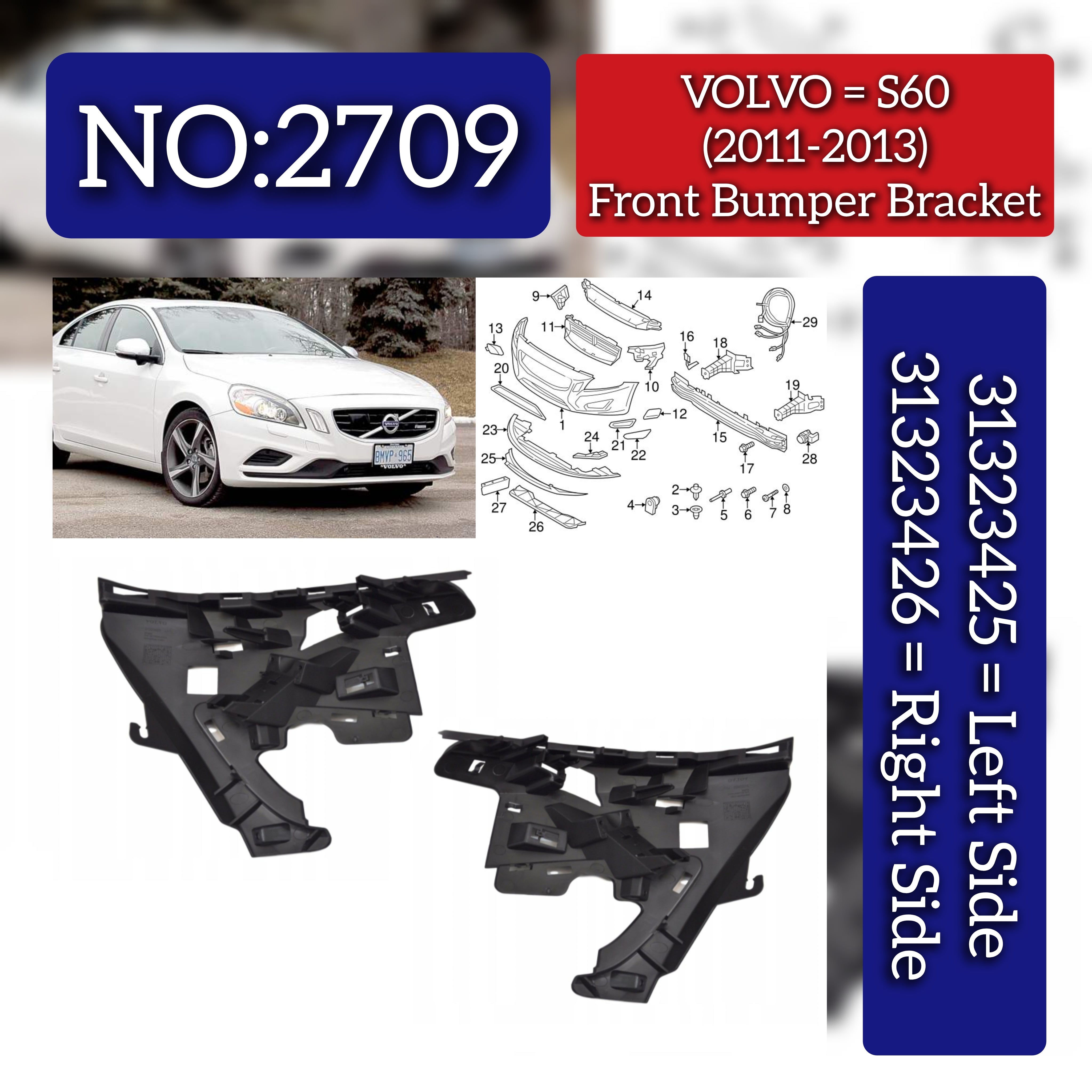 Designed specifically for the VOLVO S60 model years 2011 to 2013, these front bumper brackets (Left: 31323425, Right: 31323426) ensure precise fitment and structural support. Manufactured to match OEM standards, they provide reliable mounting points for the front bumper, enhancing vehicle safety and maintaining alignment integrity. Ideal for professional repairs or replacements, these brackets help preserve the original design and functionality of your vehicle’s front end. Tag No.2709 confirms authenticity and compatibility for seamless installation.