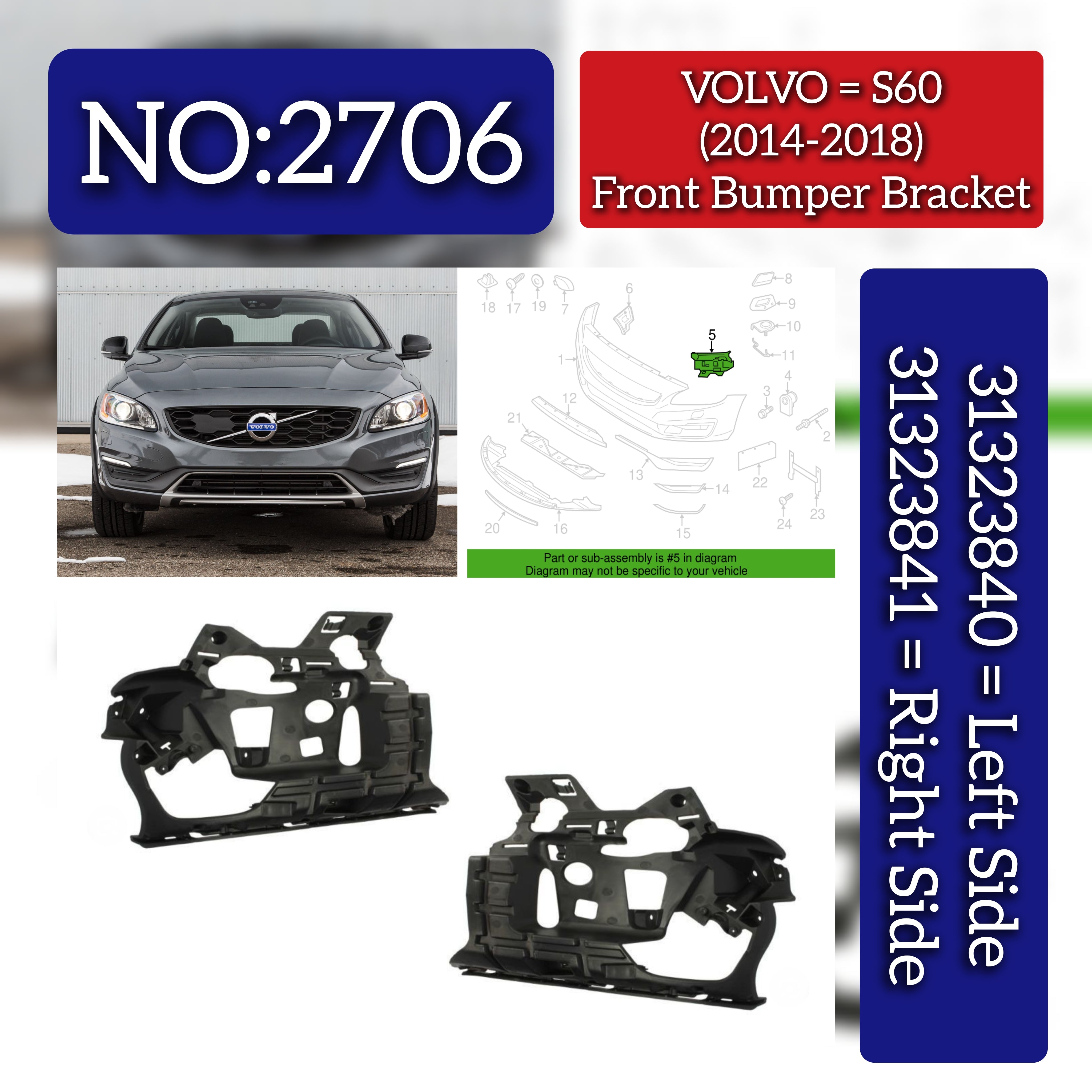 Designed specifically for Volvo S60 models from 2014 to 2018, these front bumper brackets (Left: 31323840, 31364356; Right: 31323841, 31364357) provide precise fitment and reliable support. Manufactured to OEM standards, they ensure your bumper remains securely attached, maintaining vehicle integrity and safety. Essential for professional repairs or replacements, these brackets help preserve the original alignment and structural stability of your front end. Tag No.2706.