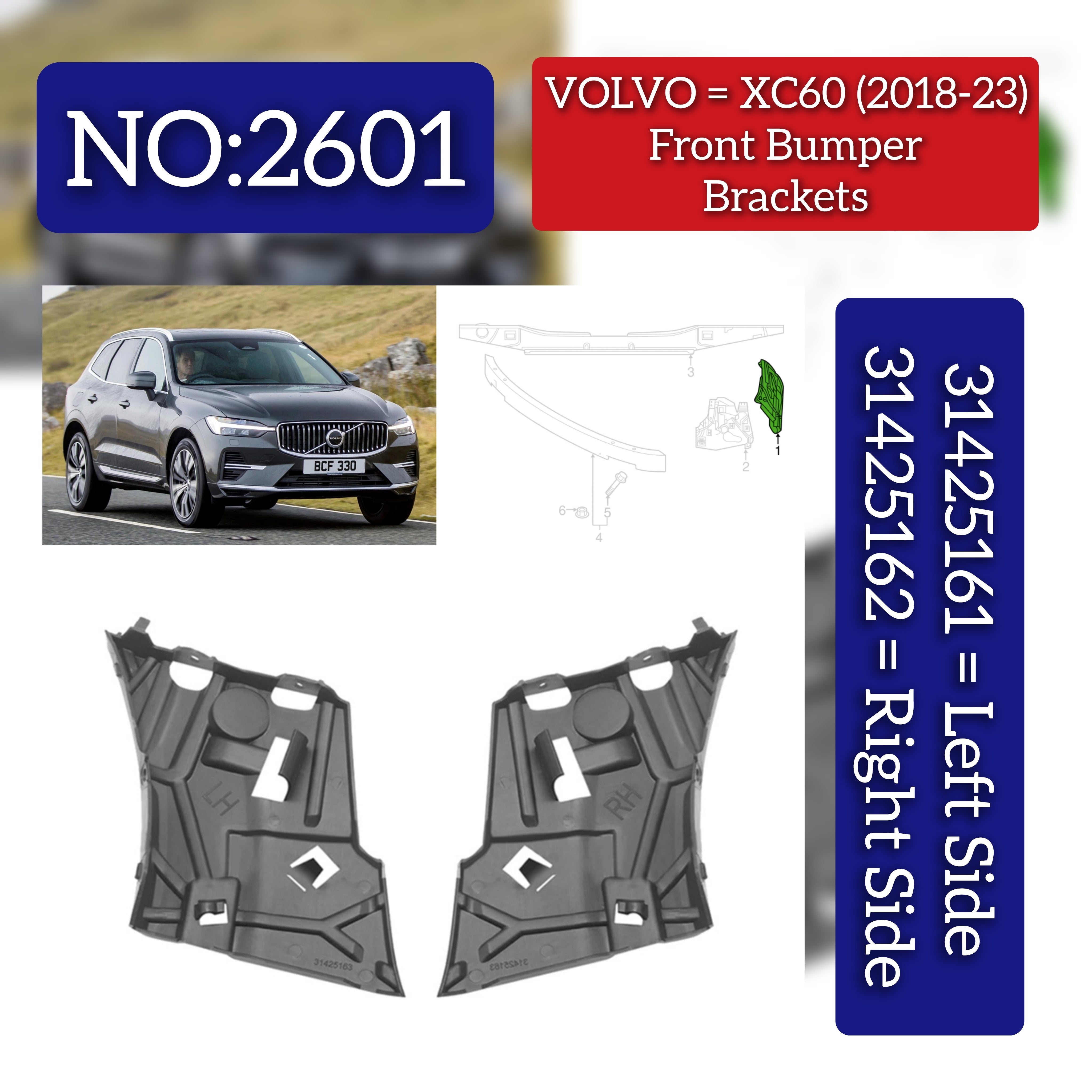 These front bumper brackets are designed specifically for the VOLVO XC60 (2018-2023). Featuring a left bracket with part number 31425161 and a right bracket with part number 31425162, they provide a secure fit for your vehicle's front bumper. Upgrade your XC60's front end with these durable and compatible brackets.
