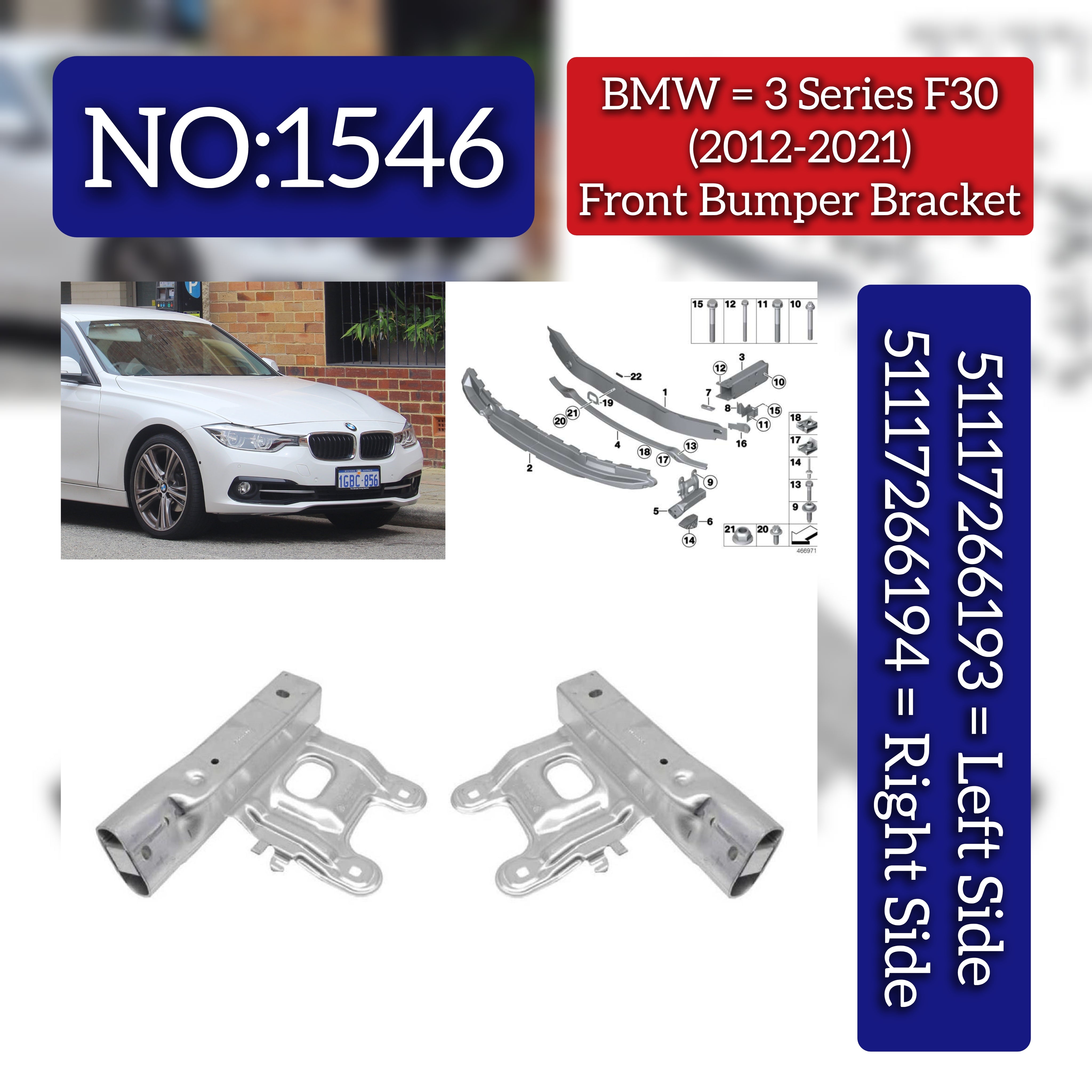 Designed for the BMW 3 Series F30 (2012-2021), this pair of front bumper brackets—right (51117266194) and left (51117266193)—ensures accurate mounting and optimal support for your front bumper. Crafted to meet OEM standards, these brackets maintain proper alignment and structural integrity, essential for maintaining your vehicle’s safety and appearance after repairs or replacement. Tag No. 1546.