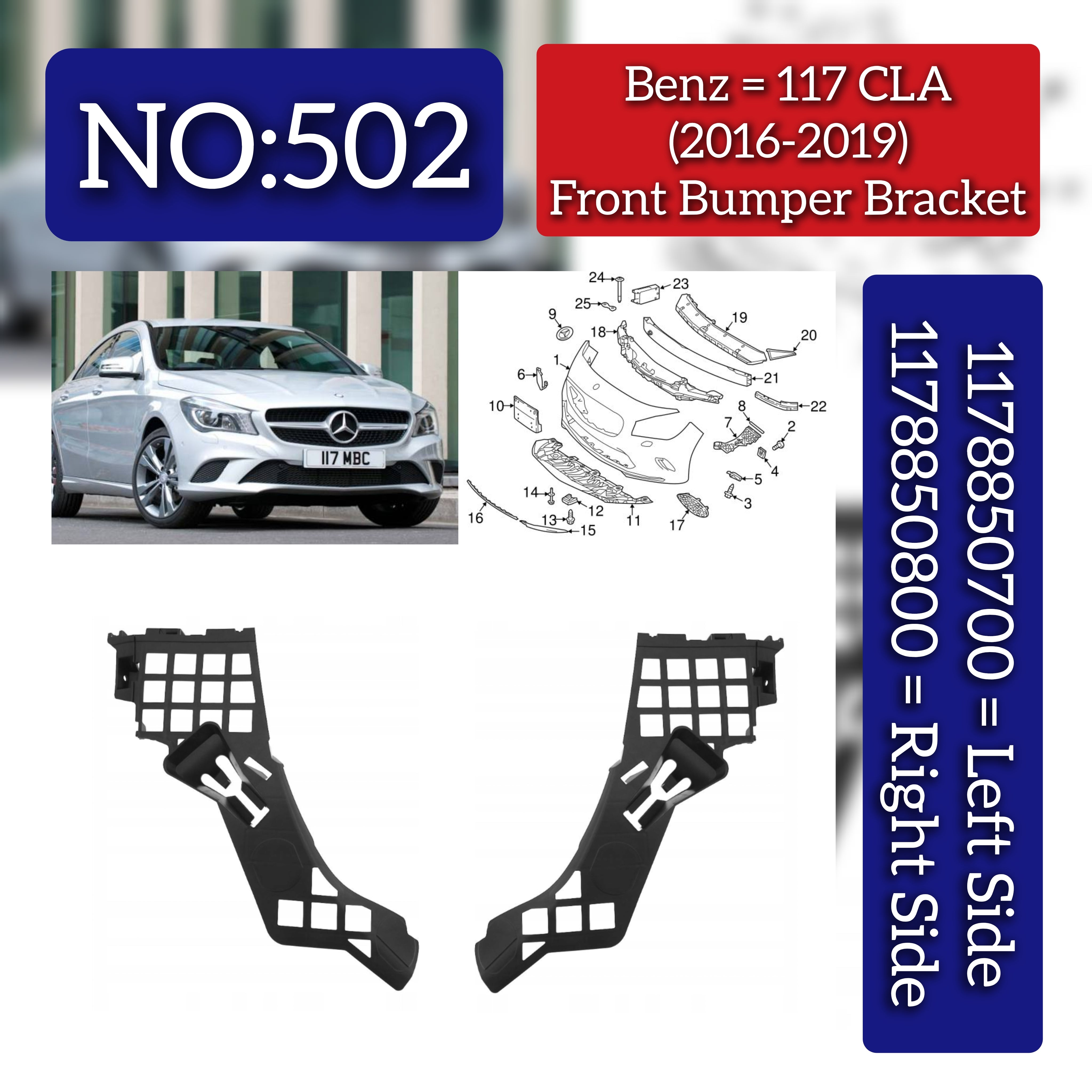 Front bumper brackets left (1178850700) and right (1178850800) are precision-engineered for Mercedes-Benz CLA C11 models from 2016 to 2019. These components ensure secure mounting and optimal alignment of the front bumper, preserving vehicle safety and structural integrity. Manufactured to meet OEM standards, they provide reliable durability and fitment, making them essential for professional-grade repairs or replacements. Tag No.502 guarantees compatibility and quality for your Mercedes-Benz CLA C11.