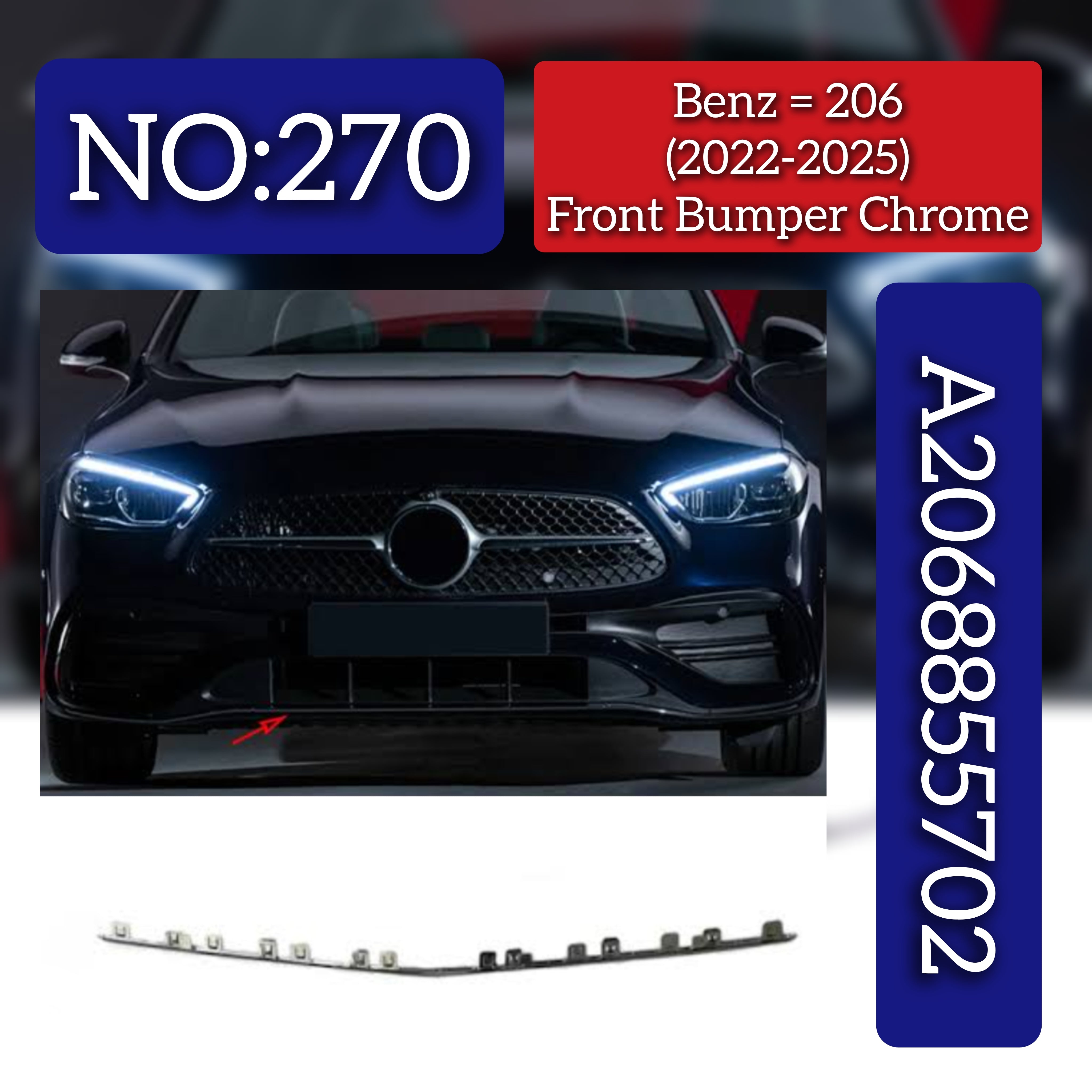 This front bumper chrome, part number 2068855702, is designed specifically for the Mercedes-Benz C-CLASS W206 models from 2022 to 2025. Engineered to meet OEM standards, it ensures a perfect fit and maintains the vehicle’s original aesthetic. Its durable chrome finish offers enhanced corrosion resistance and adds a sleek, polished look to the front end, combining style with long-lasting protection. Ideal for professional repairs or upgrades, this bumper component supports both functionality and the premium appearance of your Mercedes-Benz.
