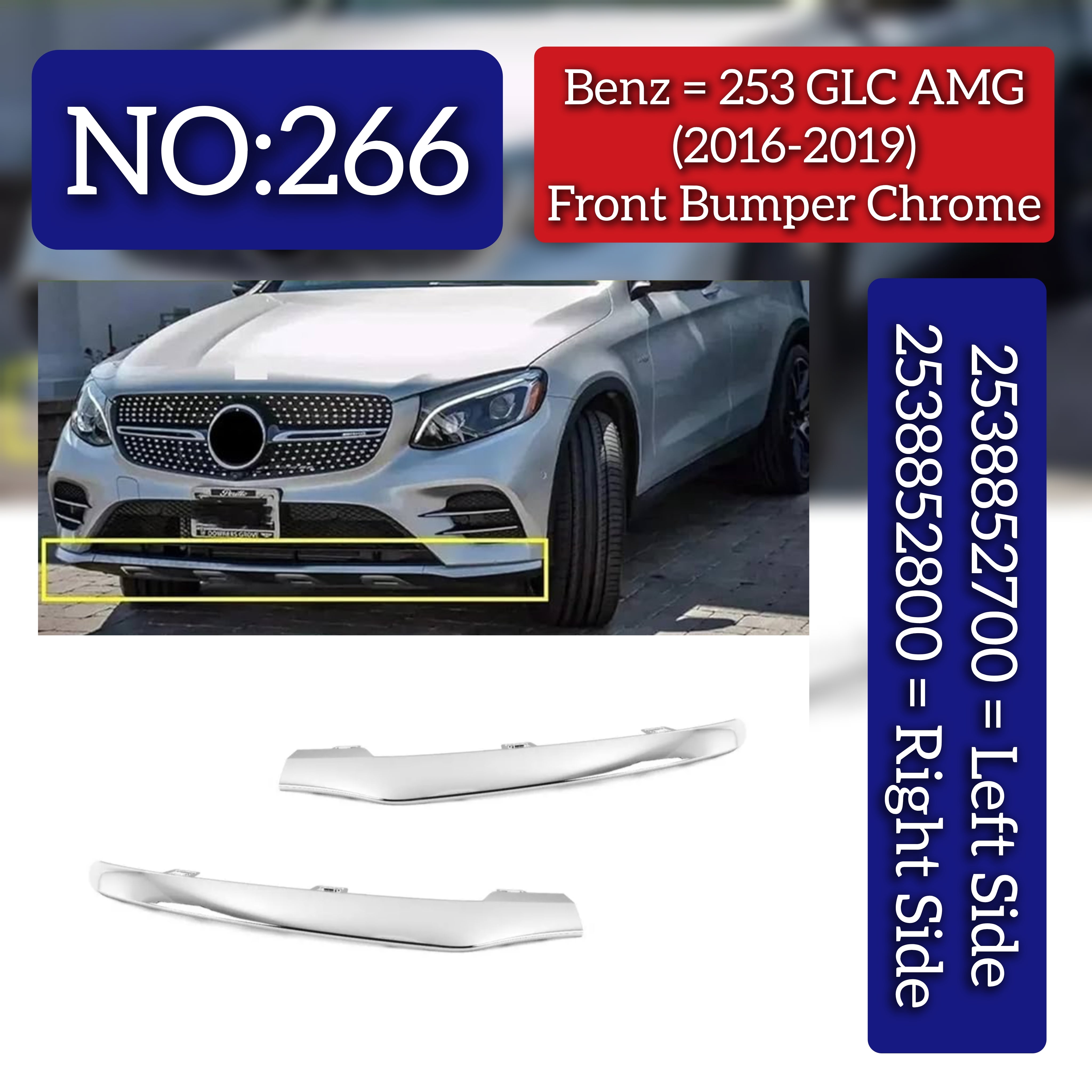 Enhance the front appearance of your Mercedes-Benz GLC-CLASS W253 (2016-2019) with these precision-engineered chrome front bumpers. Designed as left (2538852700) and right (2538852800) replacements, they ensure a perfect fit and restore your vehicle’s original style. Crafted to meet OEM standards, these bumpers provide durable protection while maintaining the luxury aesthetic of your GLC-CLASS. Ideal for professional repairs or upgrades, they combine functionality with refined design for a seamless finish.