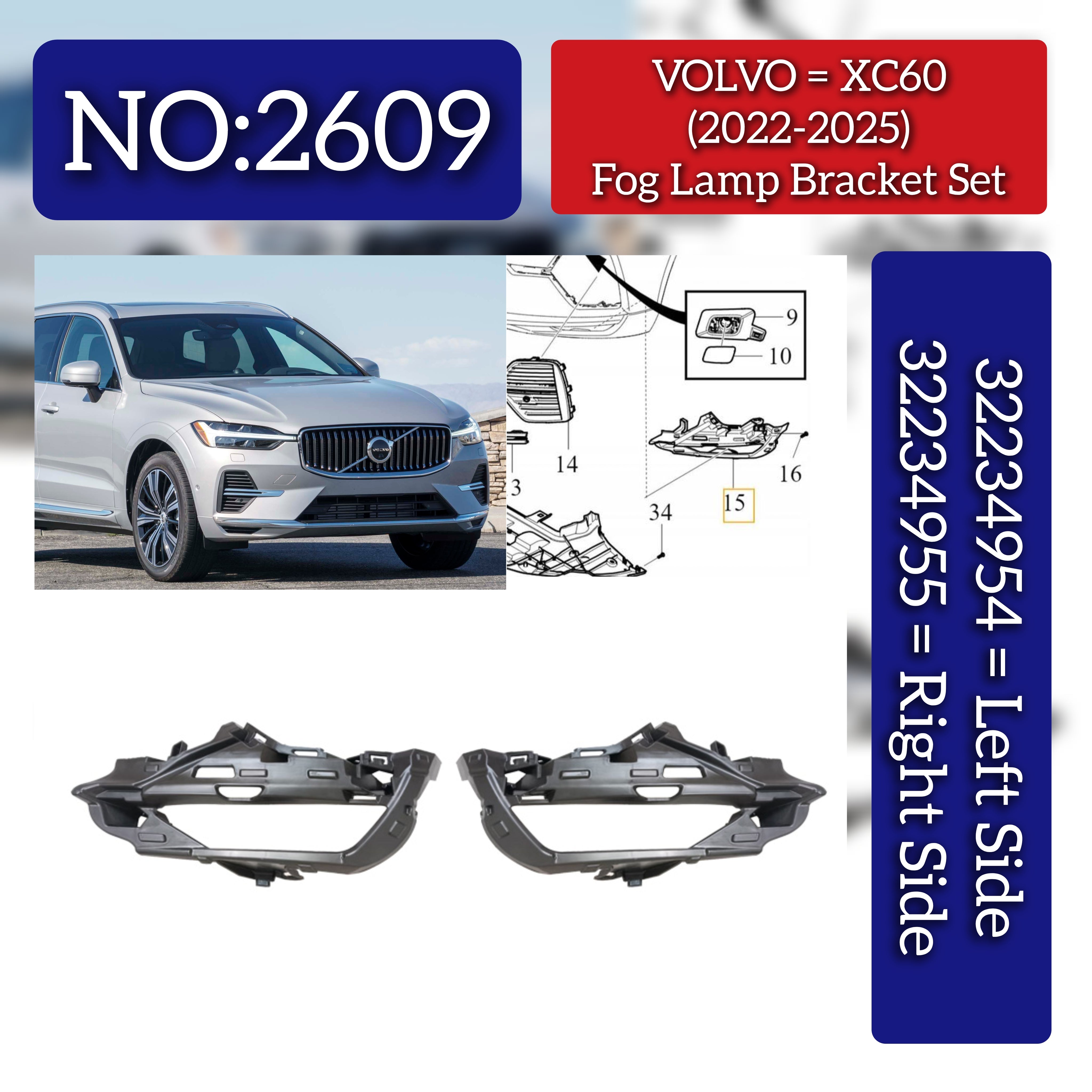 This Front Bumper Fog Lamp Brackets Set, including left (32234954) and right (32234955) components, is designed specifically for the VOLVO XC60 II (246). Engineered for precise fitment, these brackets ensure secure mounting of fog lamps, maintaining optimal alignment and durability. Ideal for professional repairs or upgrades, this set supports reliable fog lamp performance and enhances vehicle safety in low-visibility conditions. Tag No.2609 confirms compatibility and quality assurance.