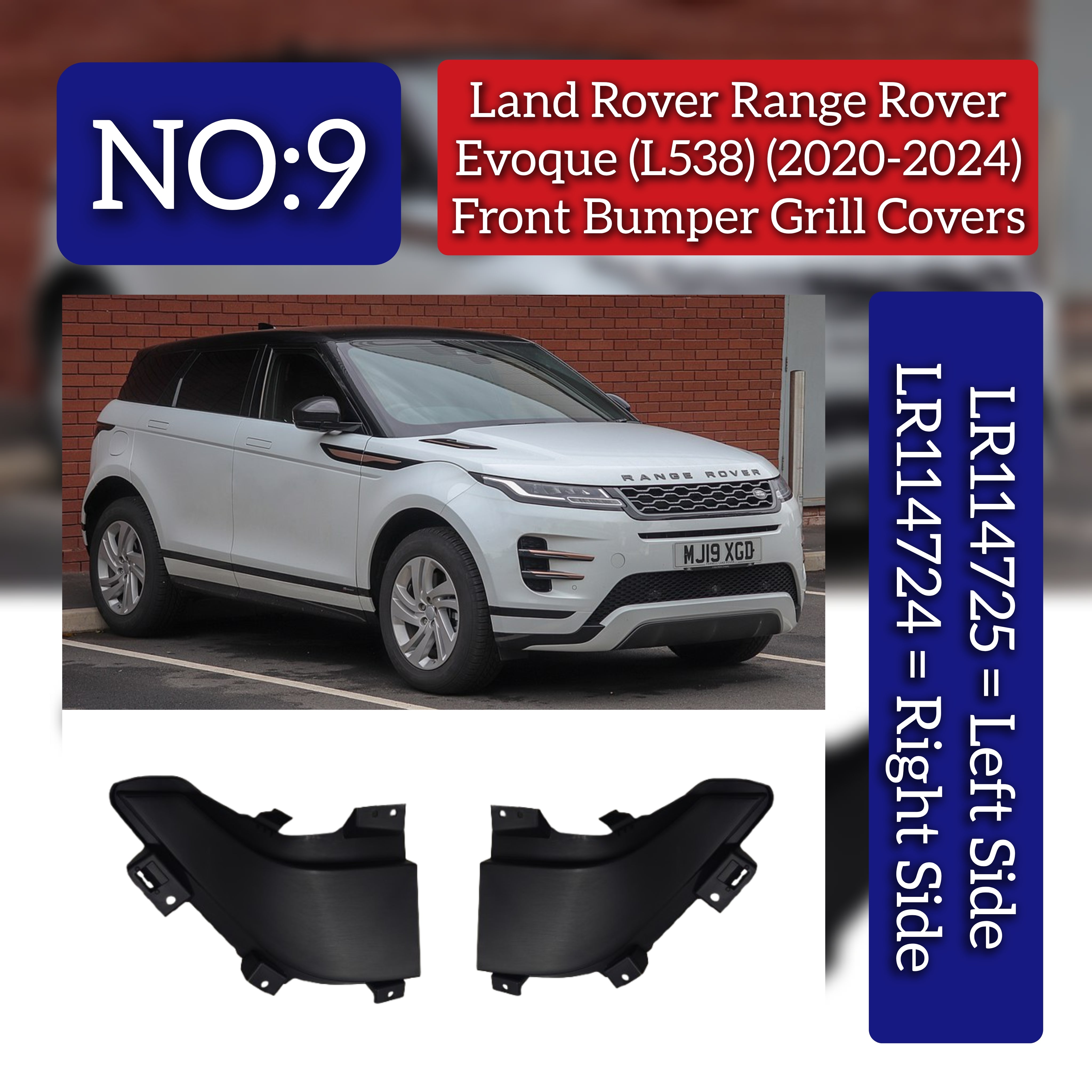 Designed specifically for Land Rover Range Rover Evoque L538 models from 2020 to 2024, these front bumper grill covers (Right LR114724 and Left LR114725) ensure precise fit and maintain your vehicle’s original aesthetic. Crafted to protect the front bumper area, they help prevent debris damage while preserving airflow for optimal engine cooling. These durable replacements maintain the integrity and style of your Evoque, aligning perfectly with factory specifications for a seamless installation and professional finish.