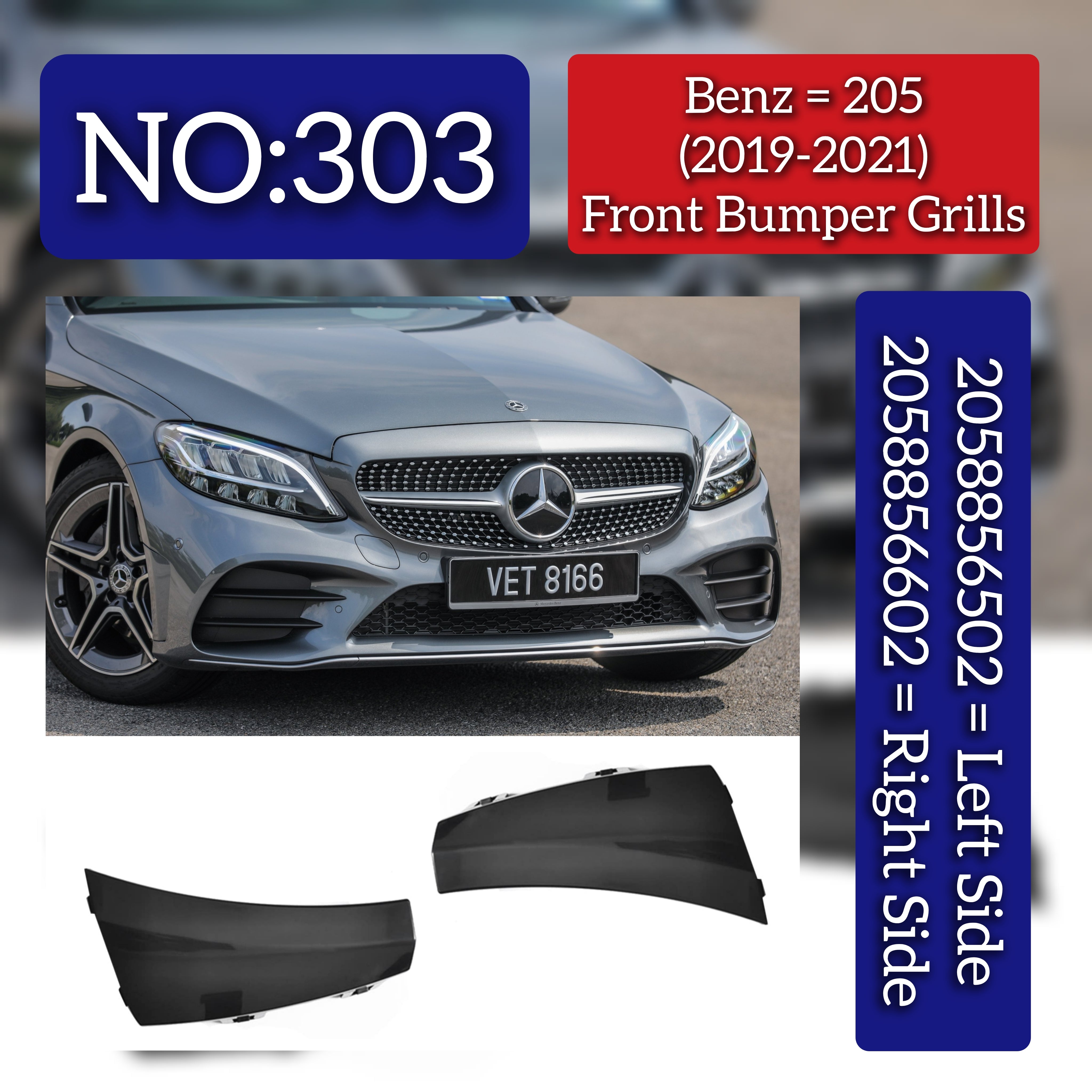 Enhance your Mercedes-Benz C-CLASS W205 (2019-2021) with these precision-engineered front bumper grills, left (2058856502) and right (2058856602). Designed for perfect fit and durability, they restore your vehicle’s original aesthetics while ensuring optimal airflow to the engine. Crafted to meet OEM standards, these grills provide reliable protection against debris and contribute to your car’s sleek, refined appearance. Ideal for professional replacements or upgrades, they maintain the integrity and performance of your C-CLASS front end.