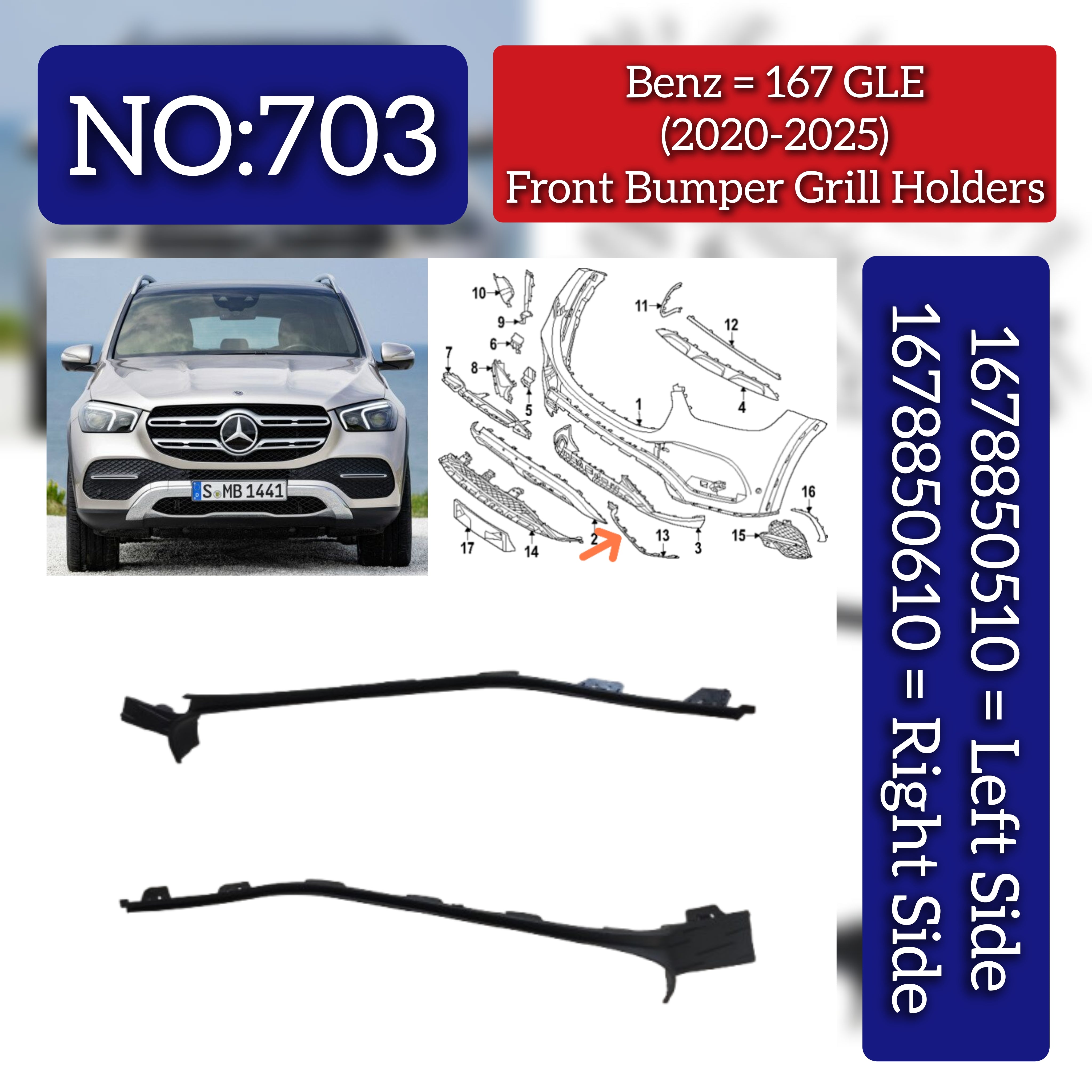 Designed for the Mercedes-Benz GLE Class W167 (2020-2025), these front bumper grille holders (left 1678850510 and right 1678850610) ensure precise alignment and secure attachment of the grille. Manufactured to OEM specifications, they provide durability and maintain the structural integrity of your vehicle’s front end, supporting both aesthetics and functionality. Ideal for professional repairs or replacements, these parts help preserve your GLE’s original performance and appearance.