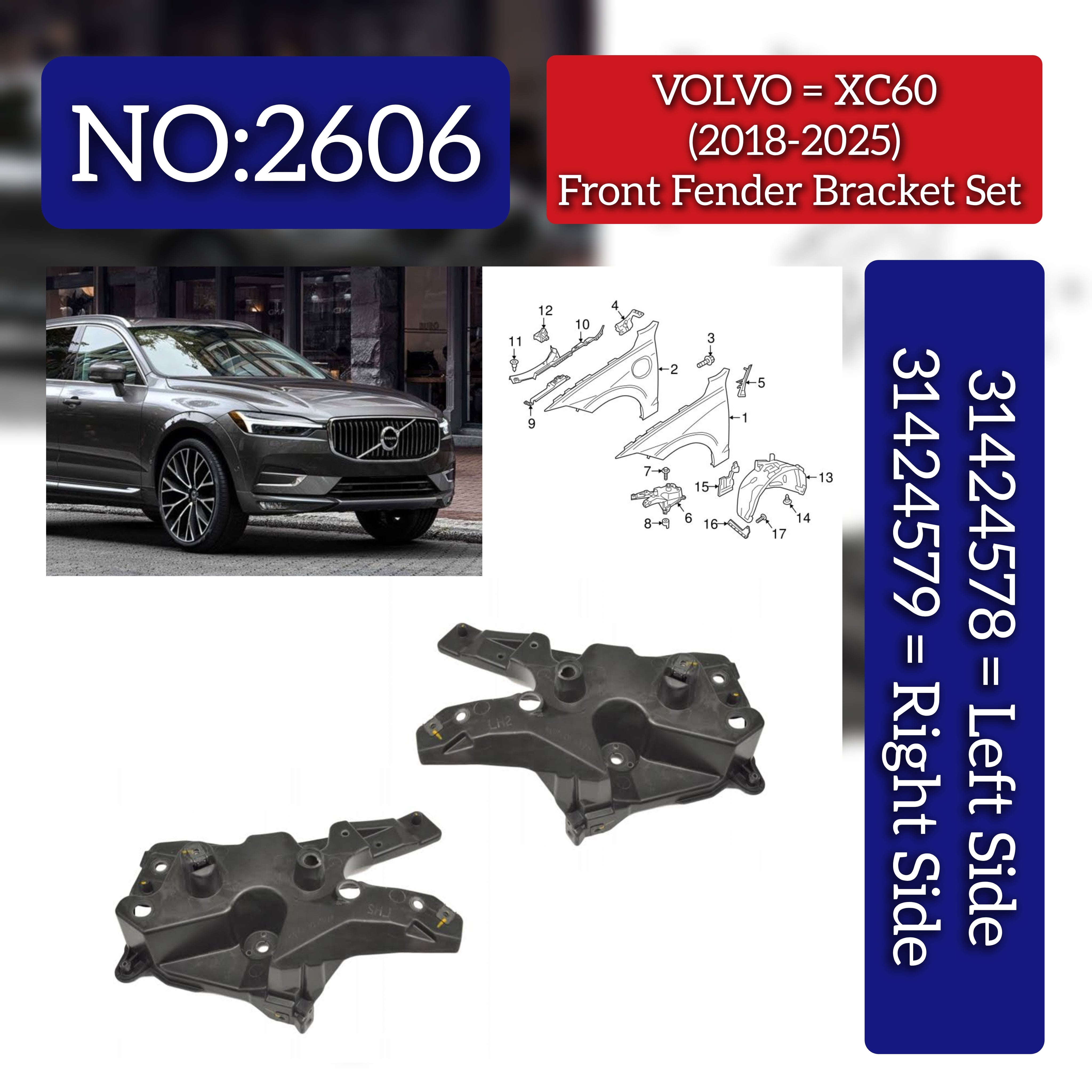 This Front Bumper Member Brackets Set, featuring left part number 31424578 and right part number 31424579, is designed specifically for the VOLVO XC60 II (246). Engineered to provide precise fitment and robust support, these brackets ensure secure attachment of the front bumper, maintaining structural integrity and alignment. Ideal for professional repairs or replacements, this set helps restore your vehicle’s front-end stability and appearance to factory standards. Tag No.2606 confirms compatibility and quality assurance for seamless installation.
