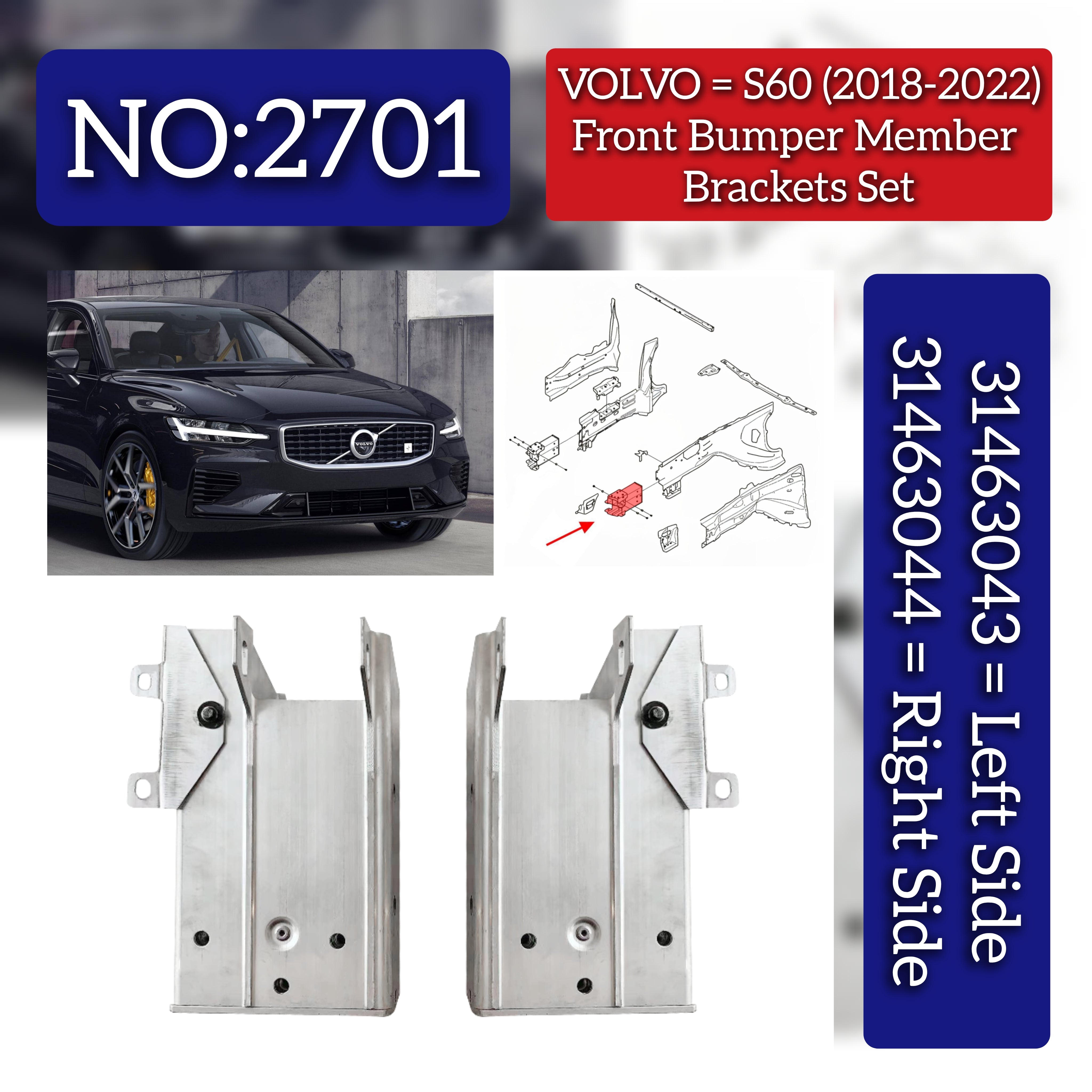This Front Bumper Member Brackets Set, comprising Left (31463043) and Right (31463044) brackets, is engineered for precise compatibility with Volvo S60 models. Designed to reinforce the front bumper assembly, these brackets ensure proper alignment and structural support, enhancing vehicle safety and durability. Manufactured to meet stringent quality standards, they offer reliable performance and ease of installation, making them an essential component for professional-grade repairs and maintenance. Tag No.2701 verifies authenticity and fitment accuracy for expert use.
