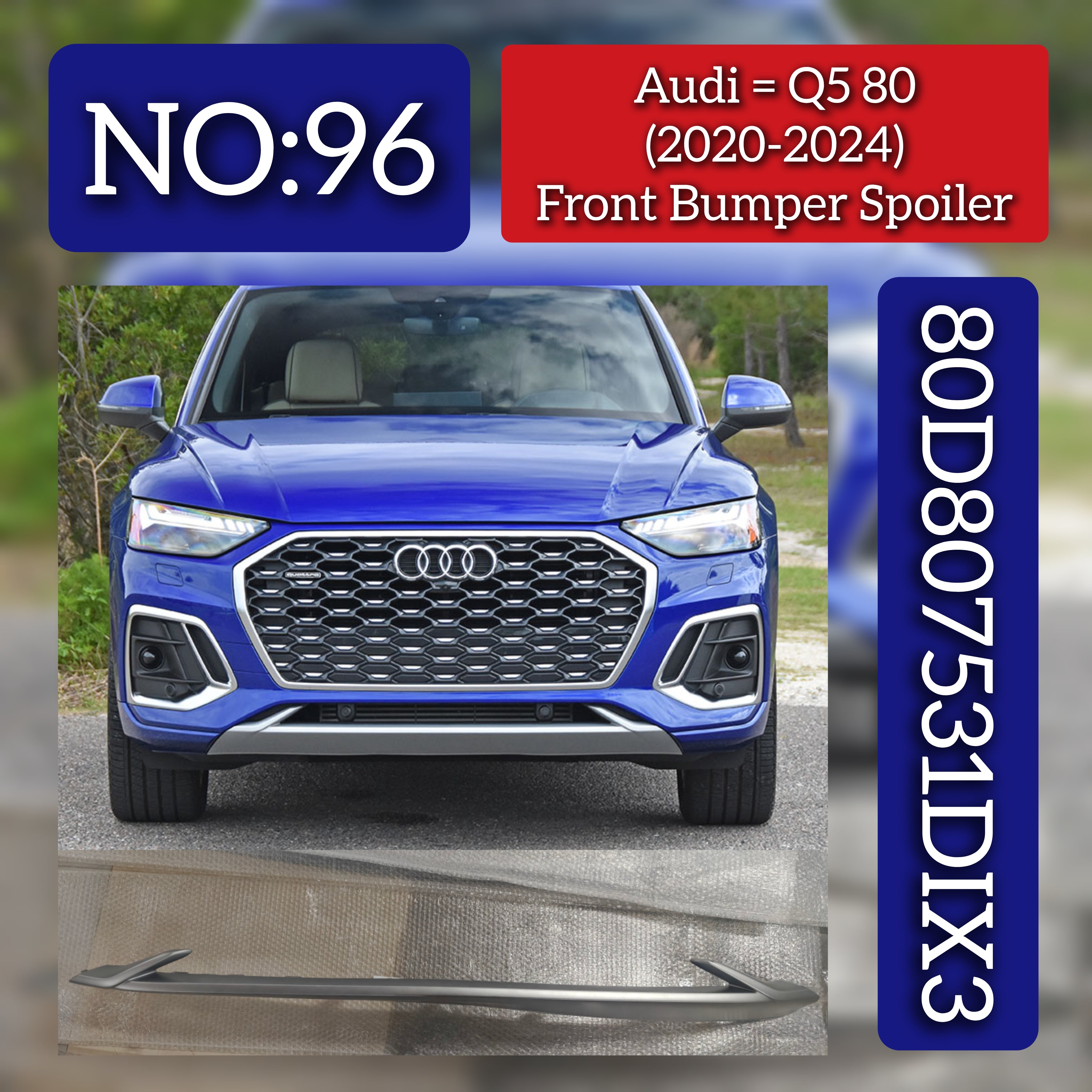 The Front Bumper Spoiler 80D807531DIX3 is engineered for seamless compatibility with the Audi Q5 80 models from 2020 to 2024. This component enhances aerodynamic efficiency, helping to reduce air resistance and improve vehicle stability at speed. Built to original equipment manufacturer (OEM) specifications, it ensures a precise fit and robust durability. Ideal for replacement or upgrade, it maintains the structural integrity and aesthetic appeal of the front end while supporting optimal performance on the road.