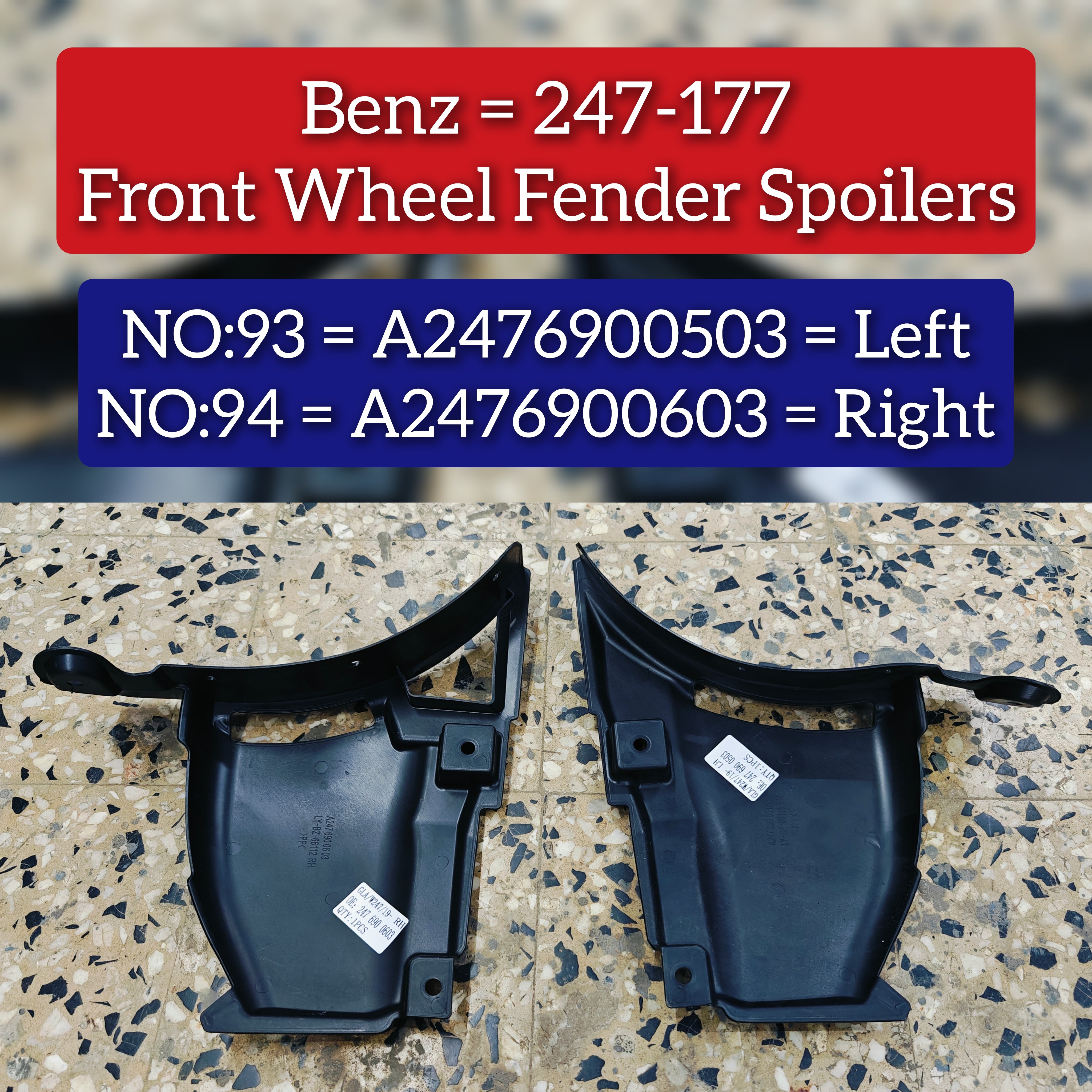 These front fender spoilers, with part numbers A2476900503 (left) and A2476900603 (right), are designed specifically for Mercedes Benz B-Class W247 and A-Class W177 models. Engineered to OEM specifications, they provide enhanced aerodynamic performance and a refined, sporty appearance. Their precise fit ensures easy installation and seamless integration with your vehicle’s exterior, making them an ideal upgrade for both aesthetics and functionality.