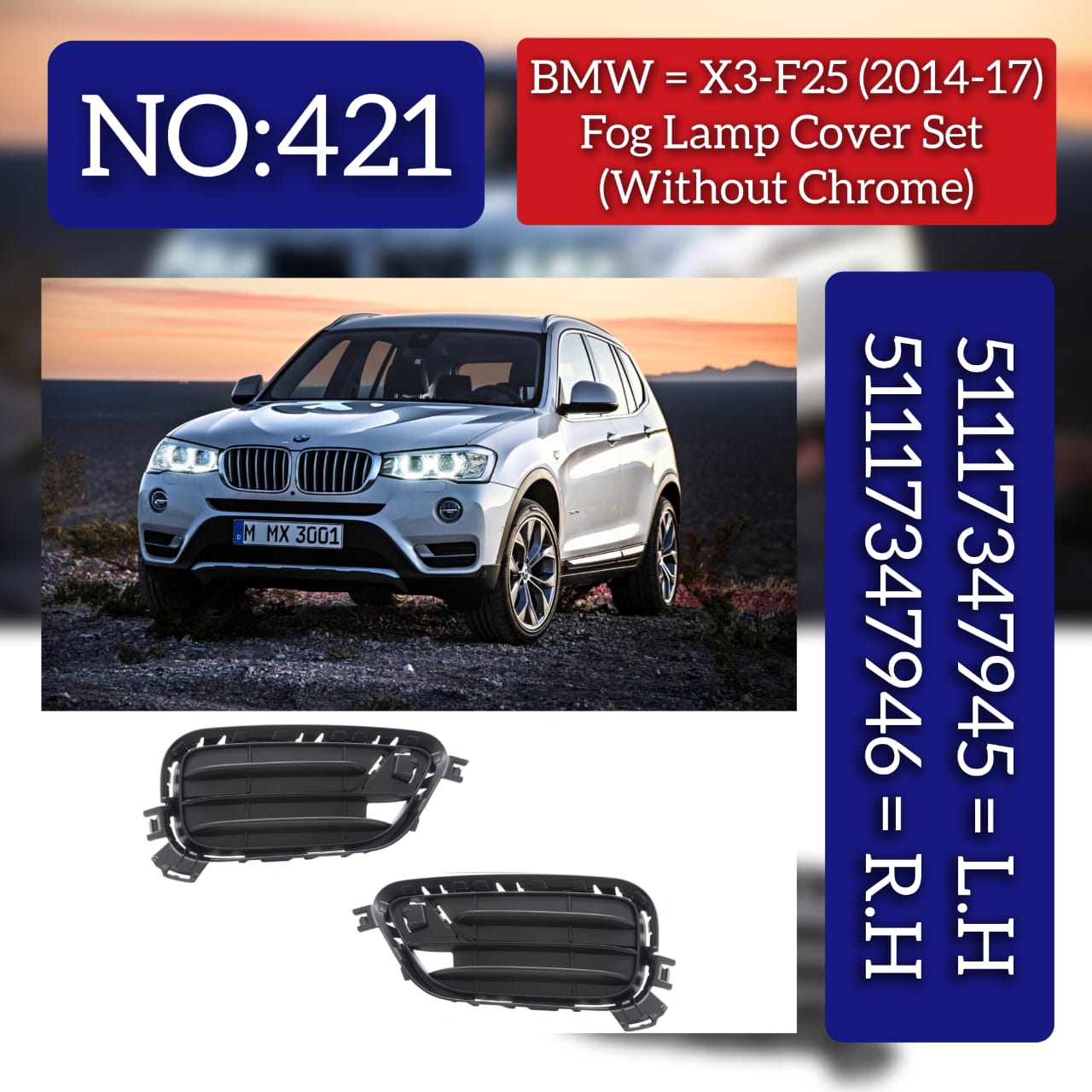 Precision-engineered fog lamp covers for BMW X3 F25 models, available for both left (511147945) and right (51117347946) sides. These non-chrome covers provide a sleek, factory-matched appearance while protecting your fog lamp assembly from road debris and environmental damage. Direct OEM-compatible fit ensures straightforward installation and proper alignment with your vehicle's front fascia.