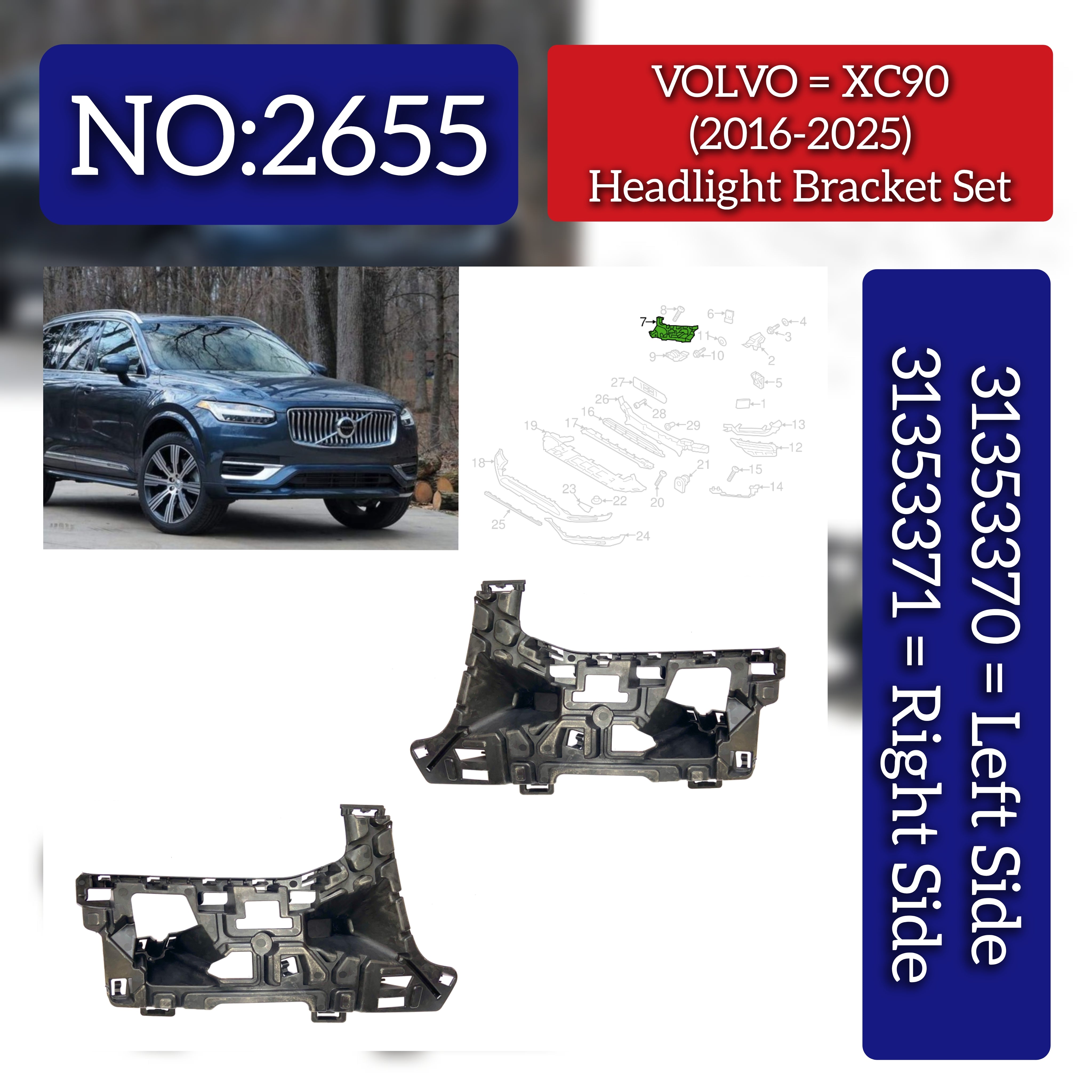 This Front Headlight Brackets Set, featuring part numbers 31353370 (left) and 31353371 (right), is designed specifically for the VOLVO XC90 I (275) model. Engineered for precise fitment, these brackets ensure secure mounting of your headlights, maintaining alignment and stability. Ideal for professional repairs or replacements, they help preserve the vehicle’s original lighting performance and safety standards. Tag No. 2655 confirms compatibility and quality assurance for your Volvo XC90.