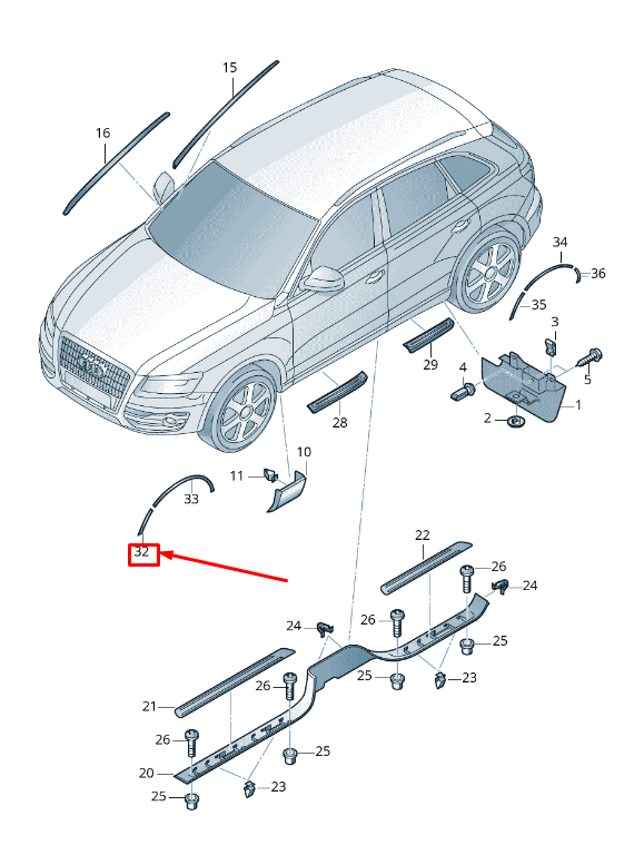 Upgrade your AUDI Q5 (8RB) with the Front Left Wheel Arch (EYEBROW) 8R0853727B! This compatible accessory not only adds a stylish touch to your vehicle, but also provides protection from road debris and weather elements. Expertly designed and made with high-quality materials, it's a must-have for any Q5 owner.