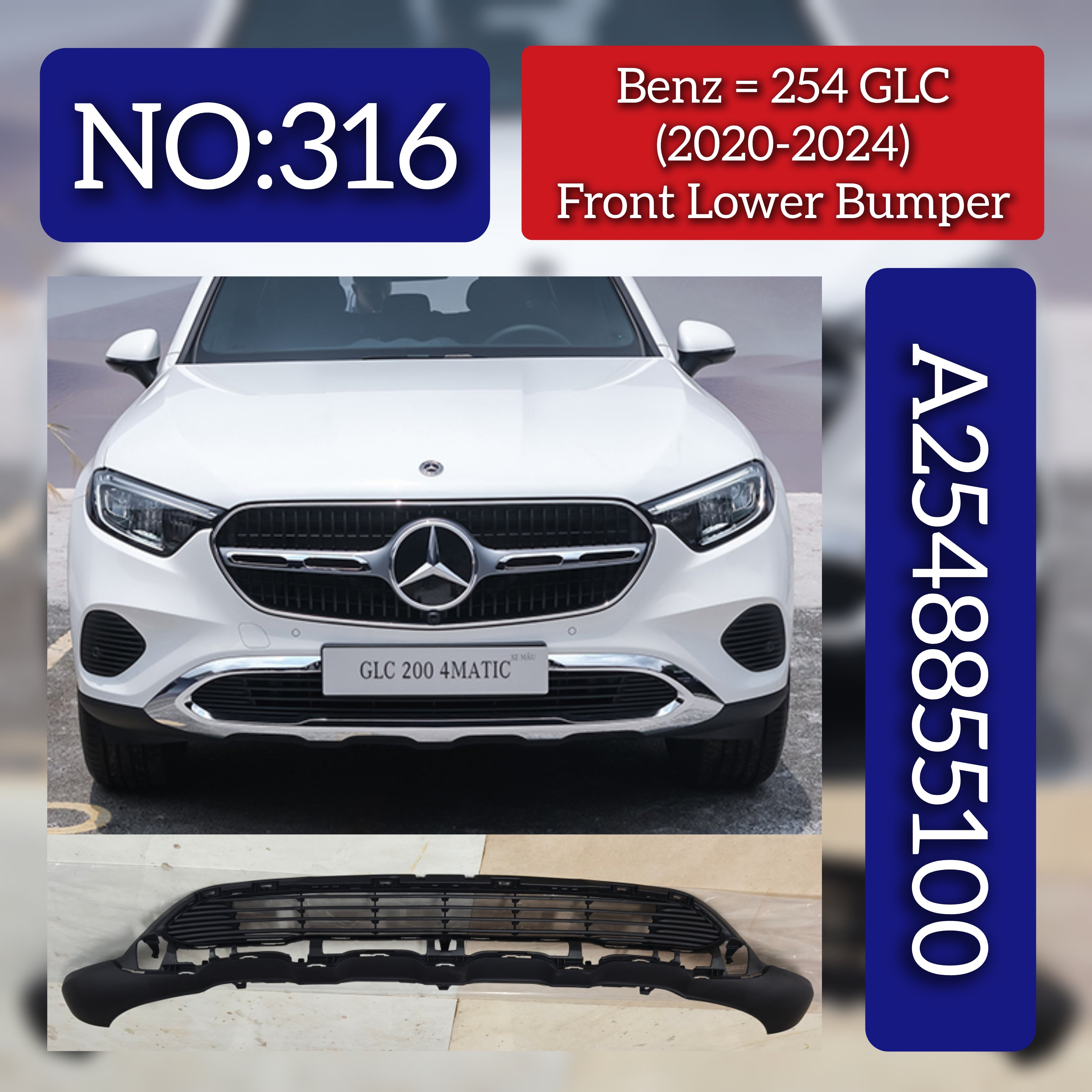 This front lower bumper (part number 2548855100) is designed specifically for the Mercedes-Benz GLC-Class W254 models from 2020 to 2024. Engineered to meet OEM standards, it ensures a precise fit and maintains the vehicle’s original aesthetics and structural integrity. Ideal for professional repairs or upgrades, this bumper provides reliable protection and preserves the sleek design of your GLC-Class. Tag No.316 confirms its compatibility and quality assurance.